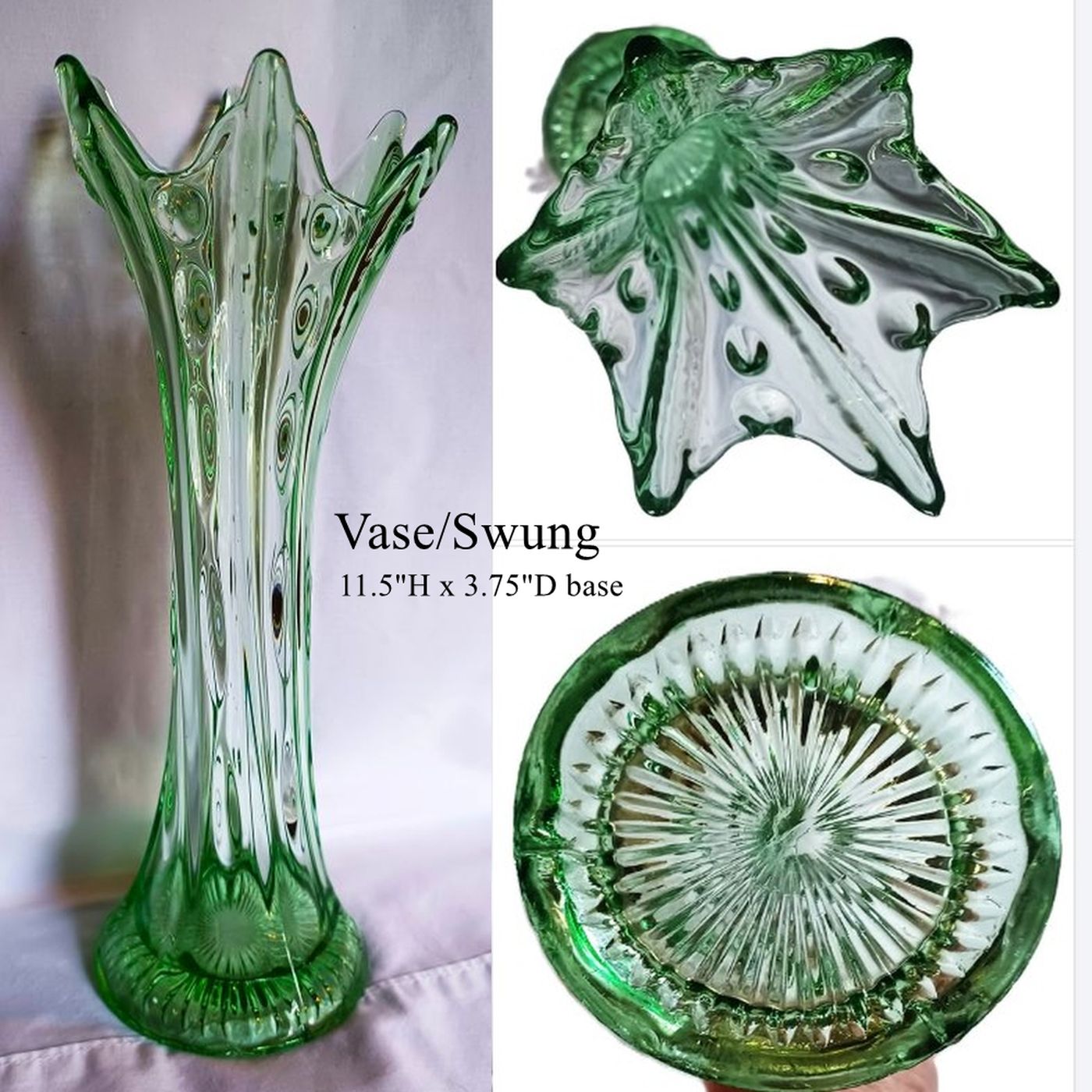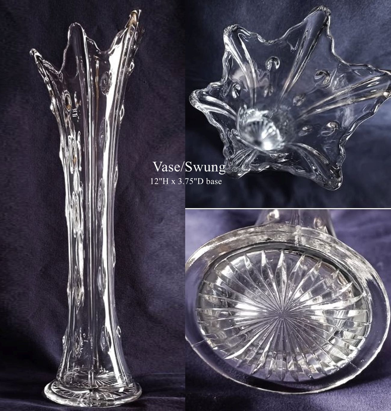 NOTE: Gene Serbus - the tall vase is No. 1026, and the short vase is No. 1027. Dugan appears to have assigned a different OMN (number) depending on height or crimp style. This vase was shown by Heacock in Collecting Glass in a "Rare & Unlisted Opalescent Glass" article. It is also shown in an undated Dugan Glass Co. catalogue (c1907) as No.1026. The ad states the "Tall Vase Assortment" was made in six fancy colors (three opalescent, Nile green, blue, and crystal). This pattern was continued by the Diamond Glass Co. but was listed as 1027-R in Diamond's Pearl Iris line.