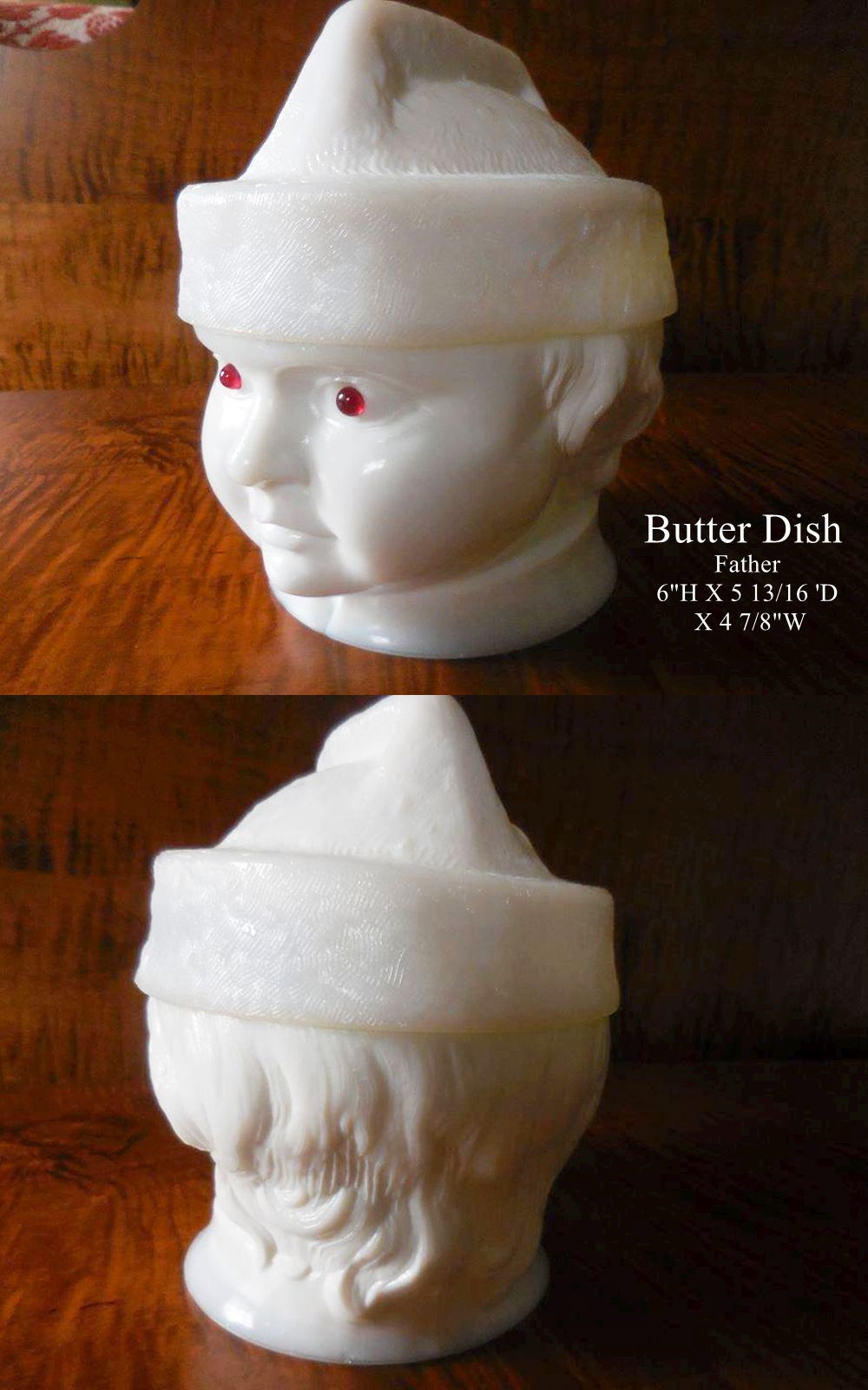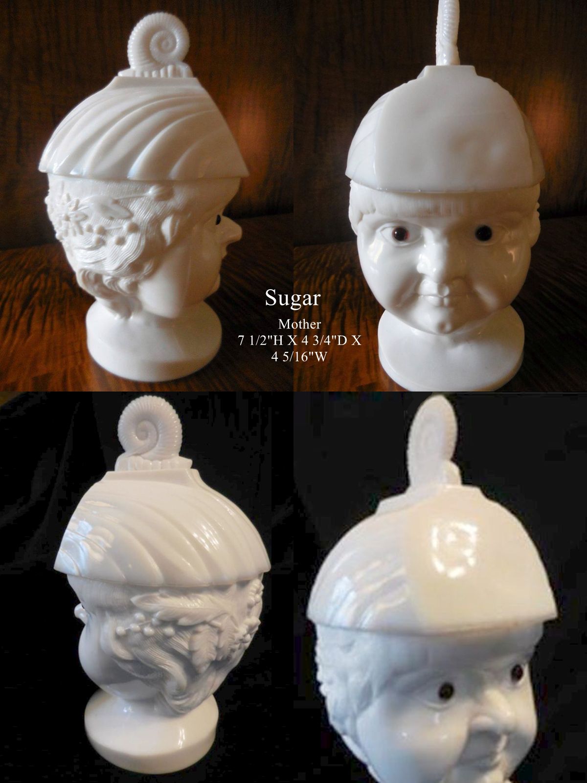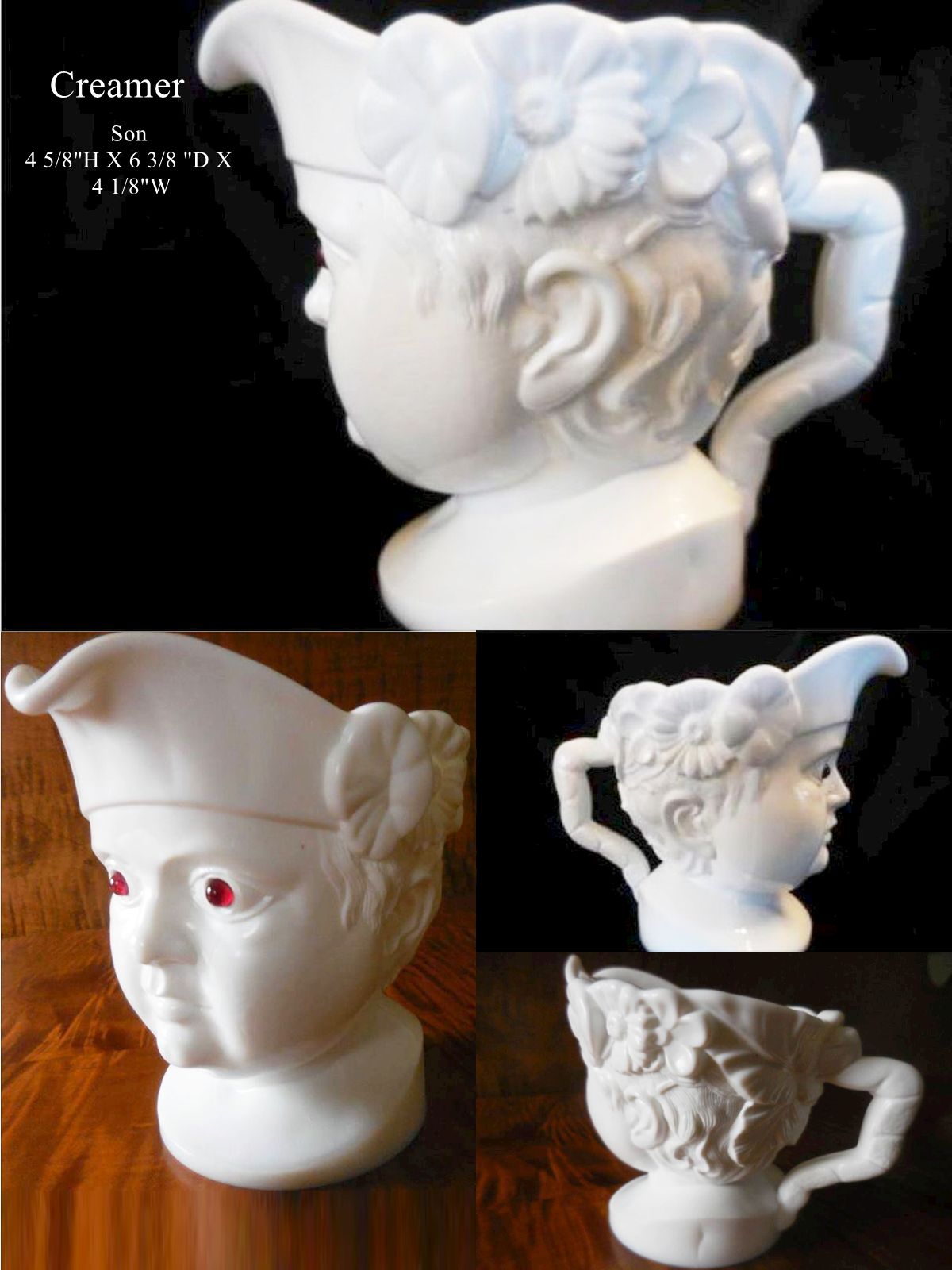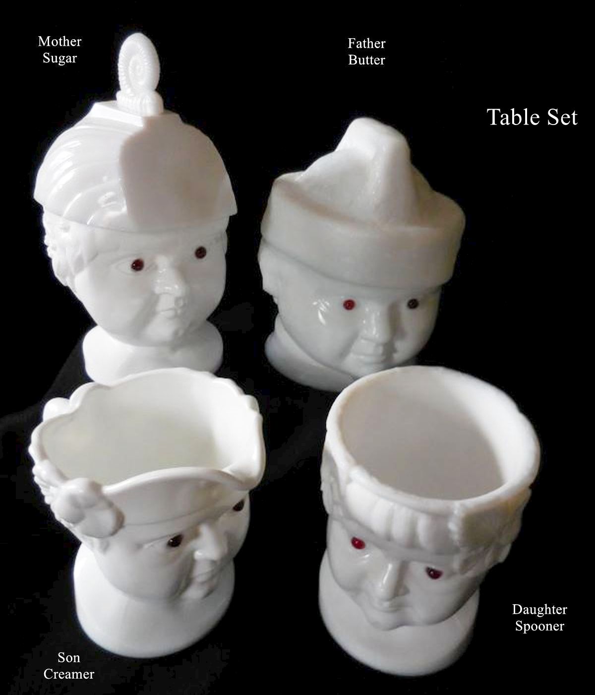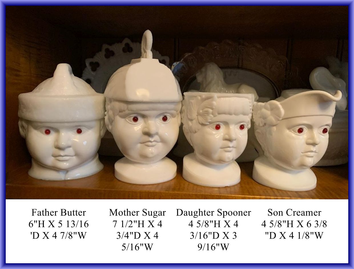 Contributor: Jeff Swantek L to R Father butter 6 H X 5 13/16 D X 4 7/8 W Mother sugar 7 1/2" H X 4 3/4 D X 4 5/16 W Daughter spooner 4 5/8 H X 4 3/16 D X 3 9/16 W Son creamer 4 5/8 H X 6 3/8 D X 4 1/8 W