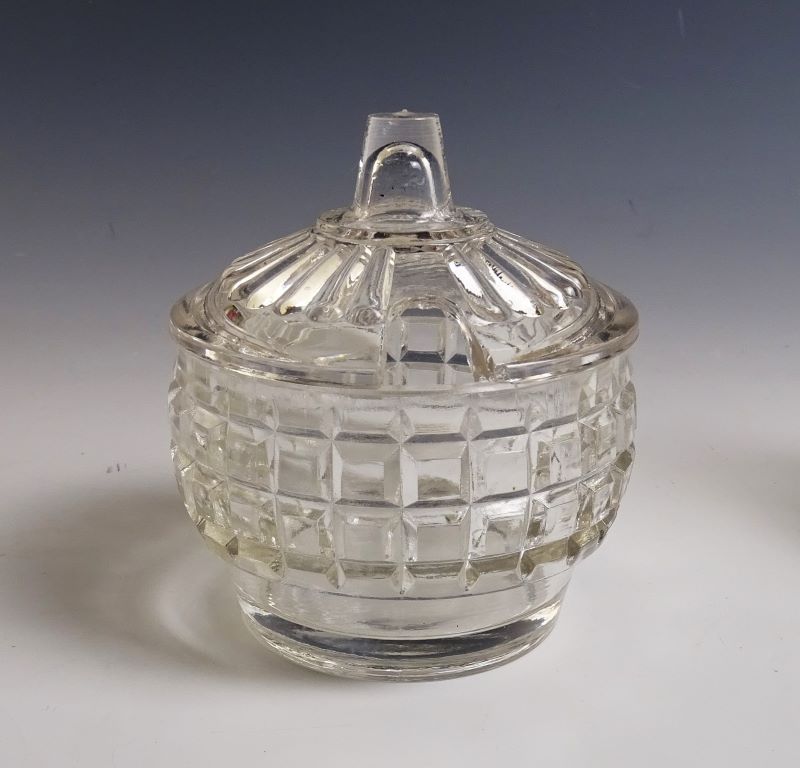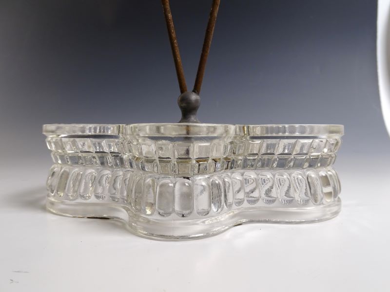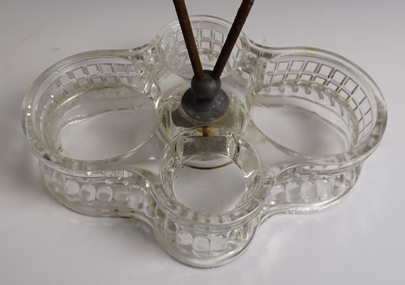 Contributor: Duane Schlosser base 7-3/8" long x 5-1/4"D and 2"H excl handle.Cruet 3" at widest X 4-1/4" high (no stopper)Mustard about 3D x 3-1/2H overall (2H base only)