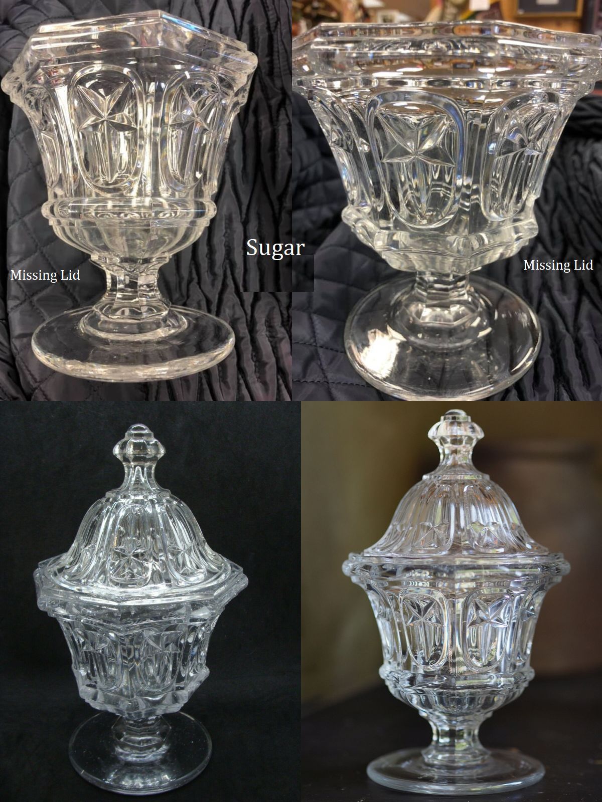 NOTE: 2020: one of three Star and Punty-type patterns. Made by Boston and Sandwich and Mt. Washington, according to Barlow and Kaiser.
