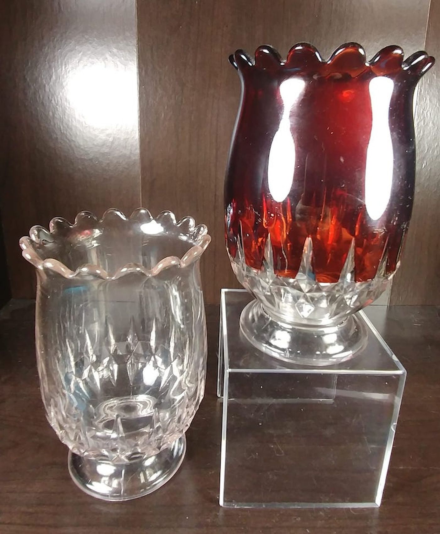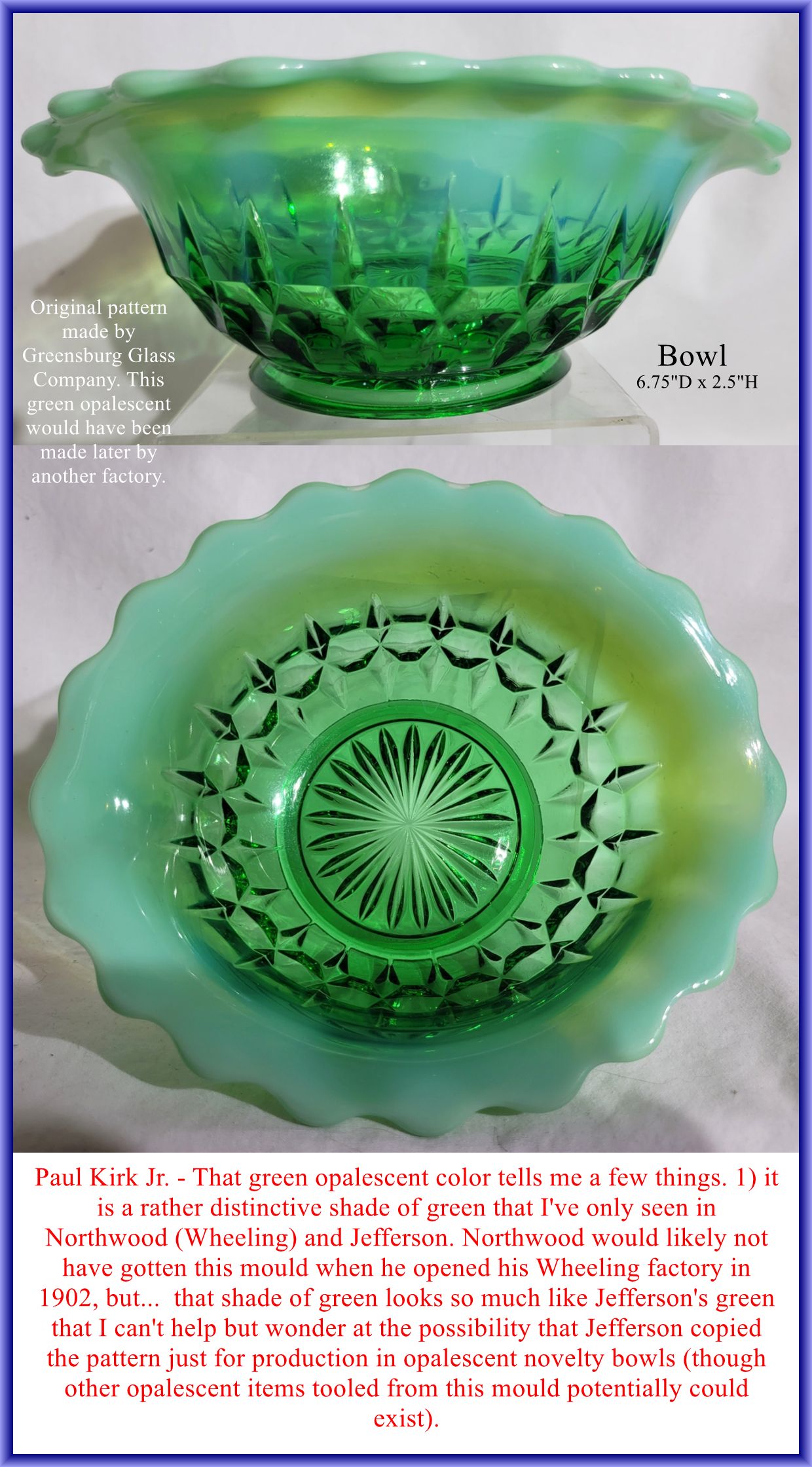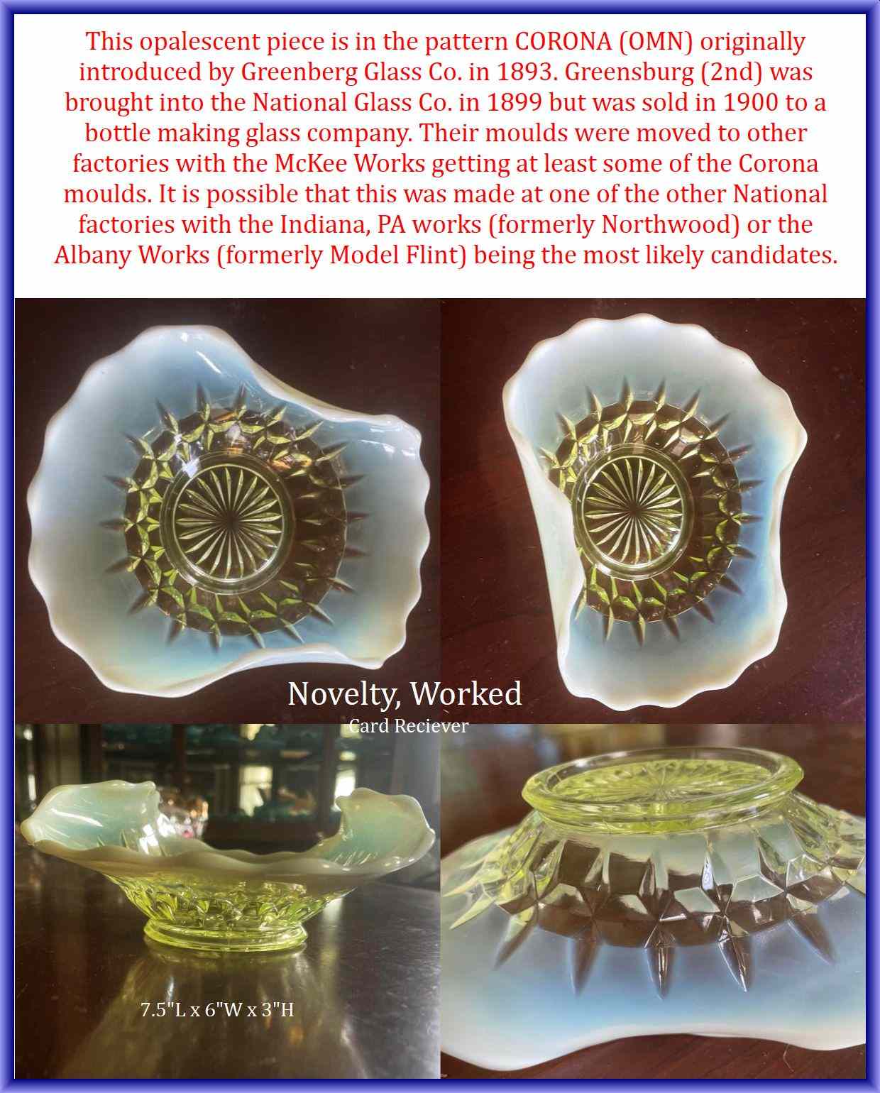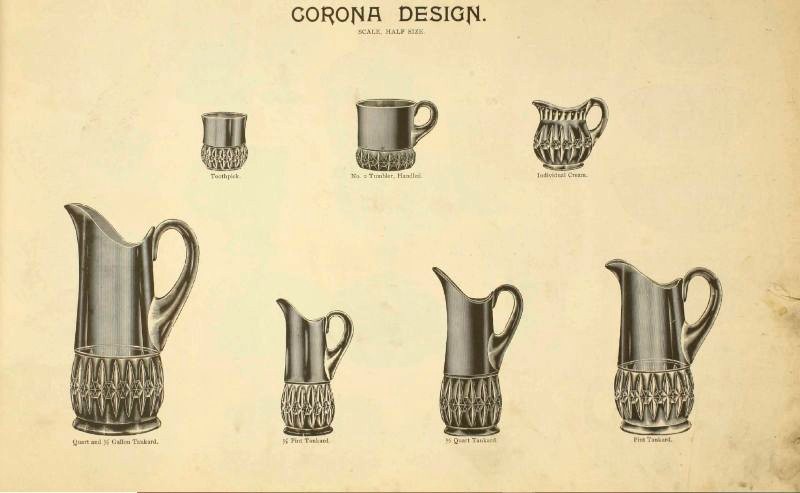 Contributor: Paul Kirk Jr- these are the only items of Corona that are shown in the c. 1901 National/McKee catalog. tankard pitchers in four sizes, individual cream, handled tumbler, and toothpick.
