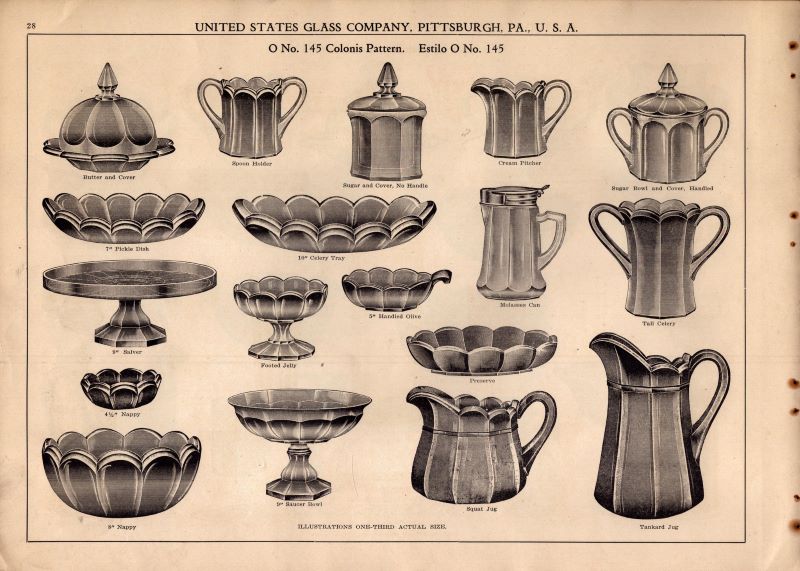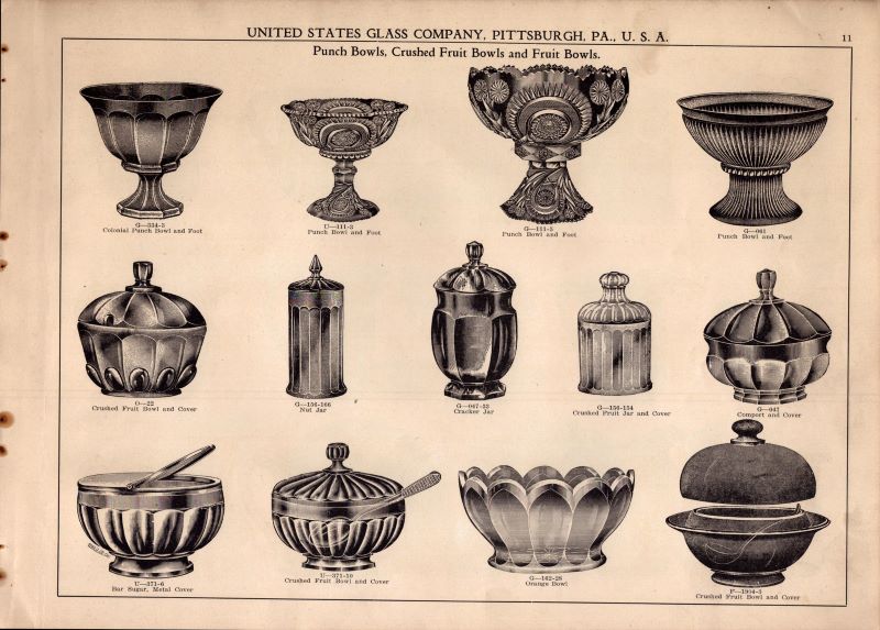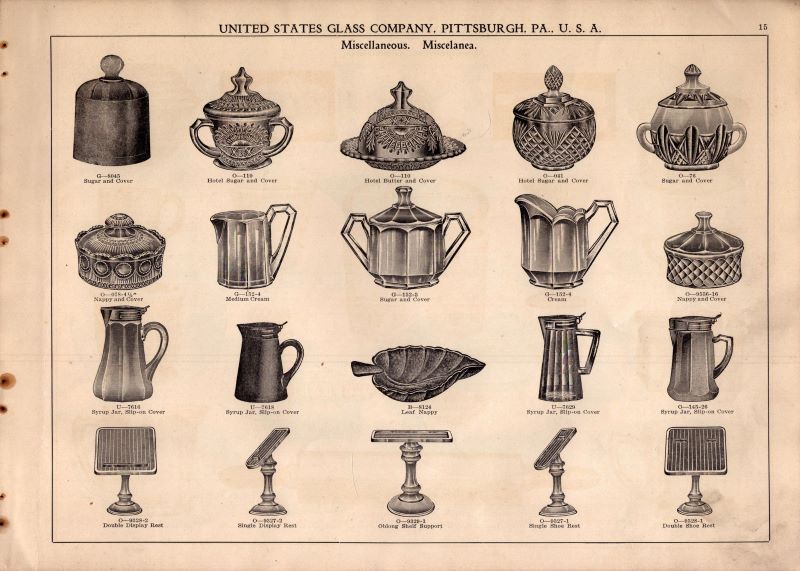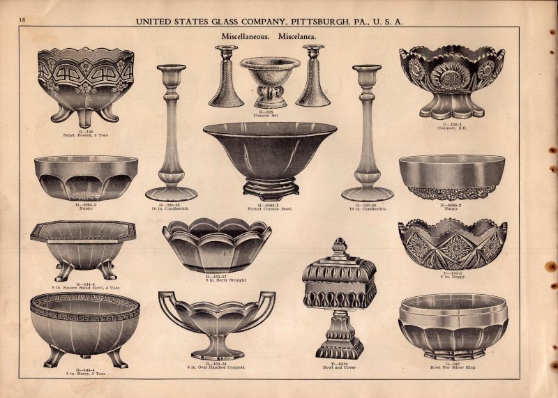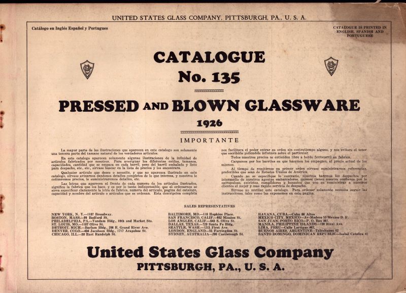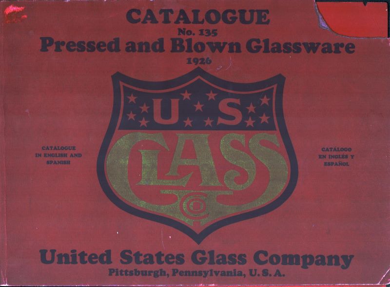 NOTE: Sid Lethbridge 2024: "United States Glass Co. Catalogue No. 135 Pressed and Blown Ware. The catalogue dates to 1926. At the time, US Glass was operating factories in Pittsburgh, PA; Gas City, IN; Glassport, PA and Tiffin, OH. The production of the last factory was limited to upper end blown wares which are not represented in this catalogue.