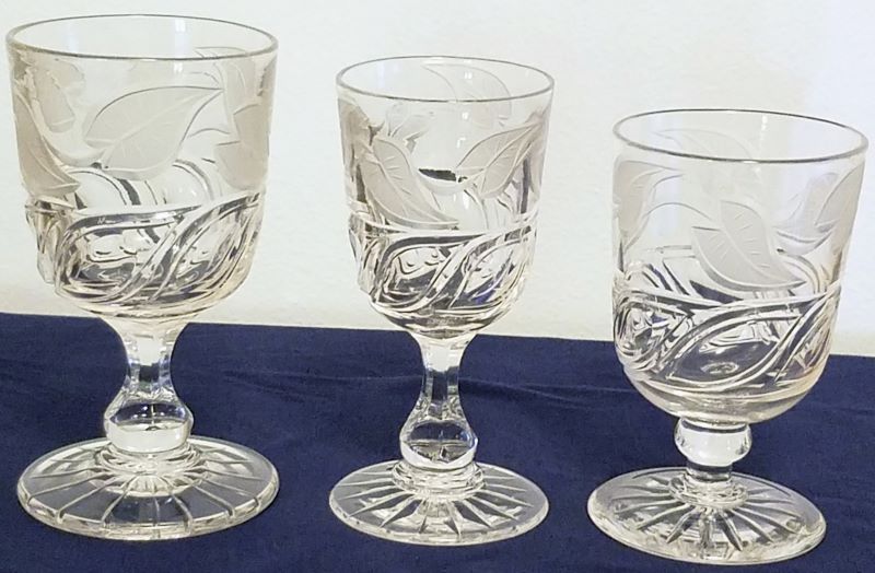 Contributor: Ursula Baumann Jeff Evans shows it in one of his recent auctions as “Frosted Leaf variant”. The picture shows a goblet 6H, champagne 5.75H and footed tumbler 5.25H.