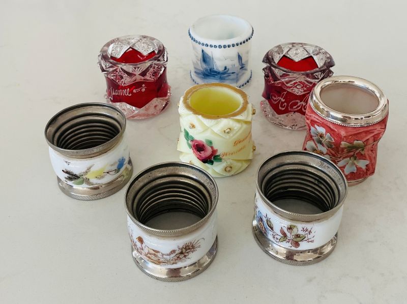 Contributor: Carole Linxwiler Bruce - Napkin rings - Mt Washington Blue Delft, Jefferson Peg Ruby Stained and Custard, CF Monroe Kelva & Wave Crest.