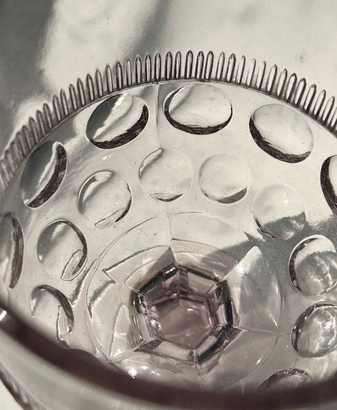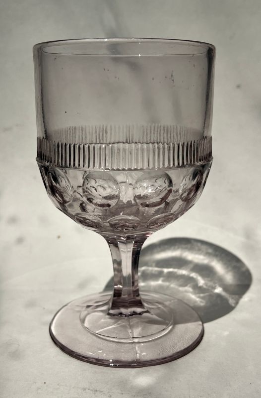 NOTE: Sid Lethbridge 2024: reference Unitt's vol 2, pp10-11. Unitts describe this goblets as "Lightweight flint with almost no ring"; Jeannie Symington's findings align with that. This piece has a purplish color and gives no indication that it's flint, yet reacts to UV weakly as flint glass does.