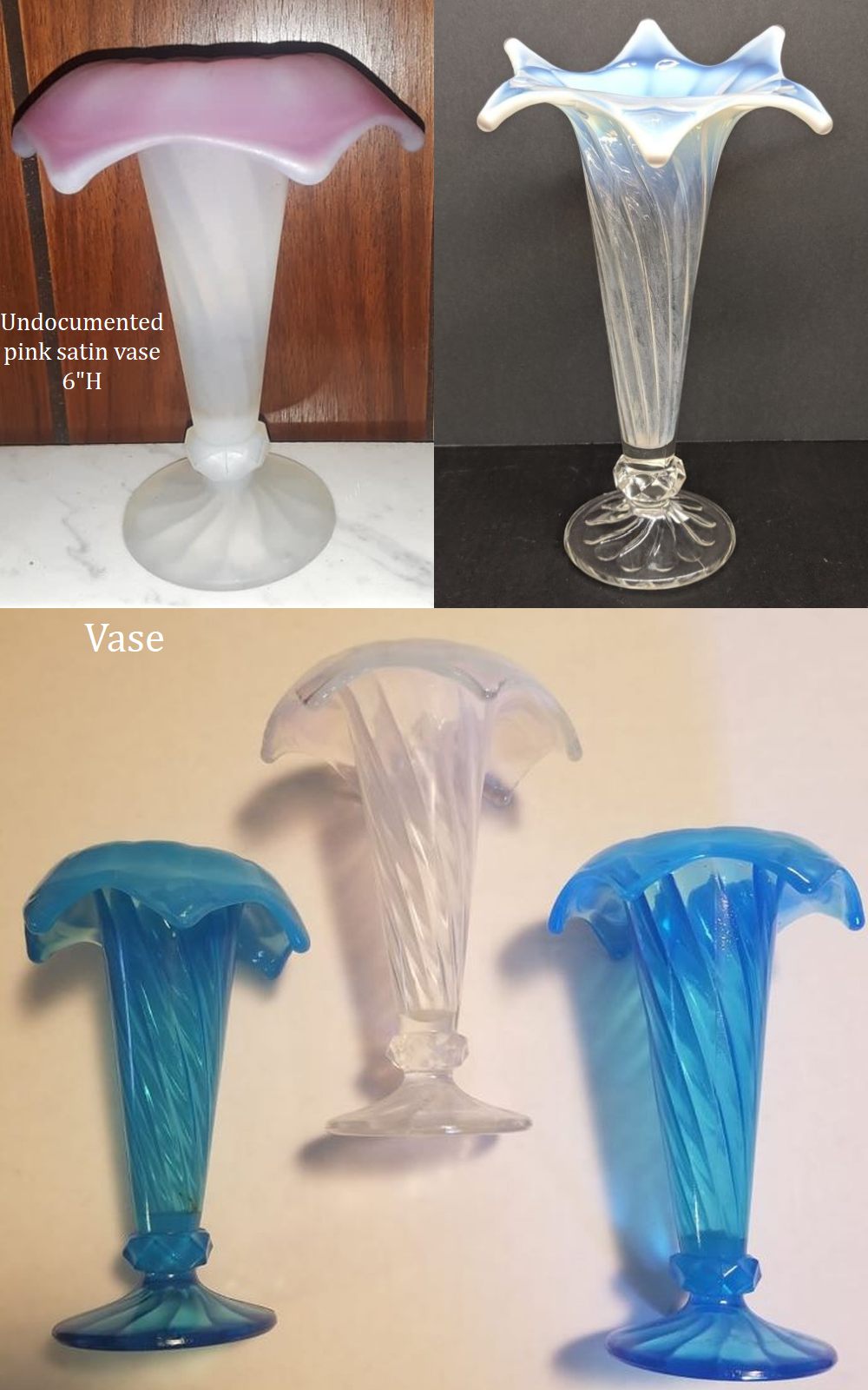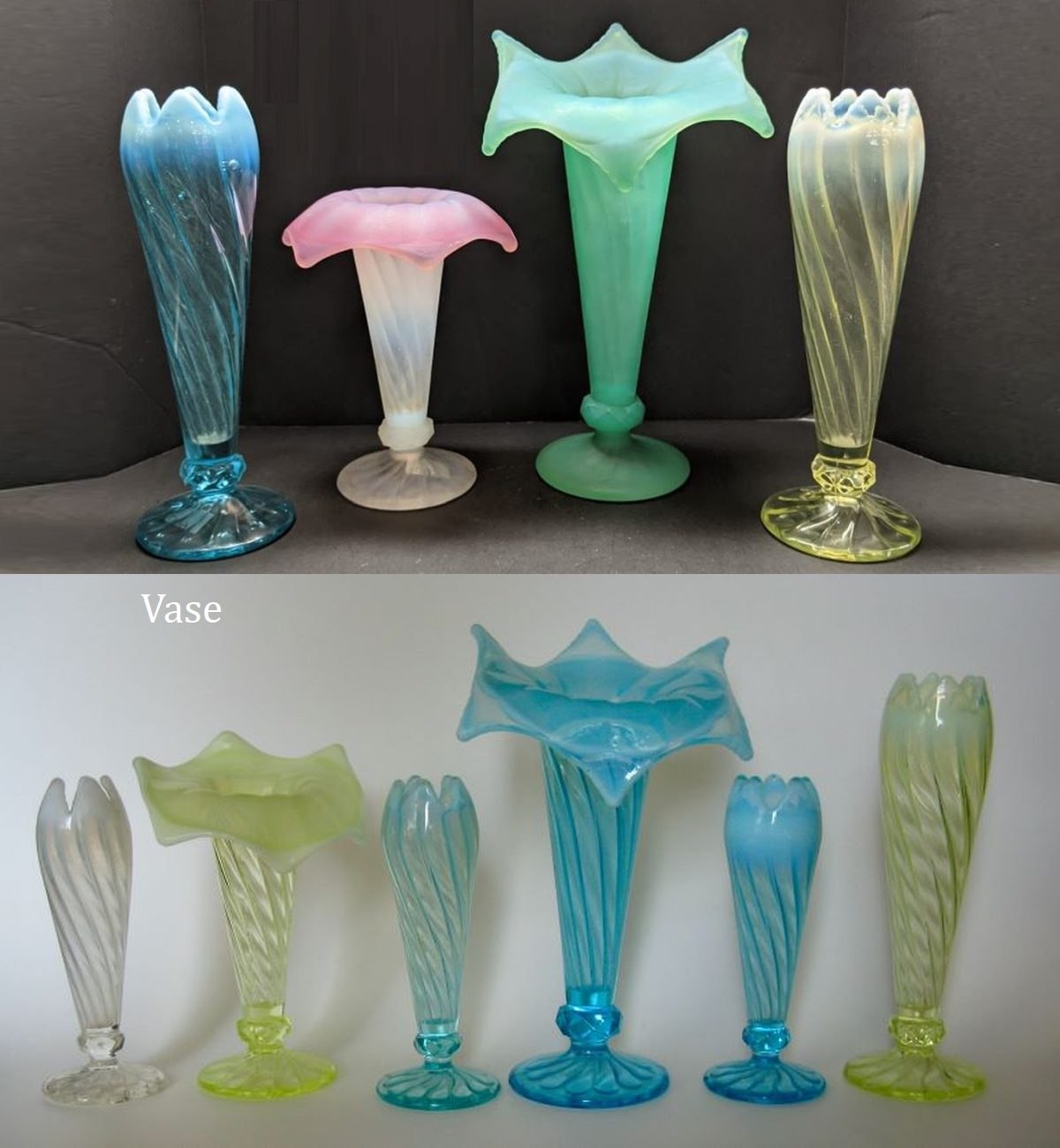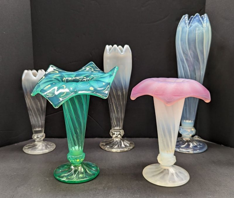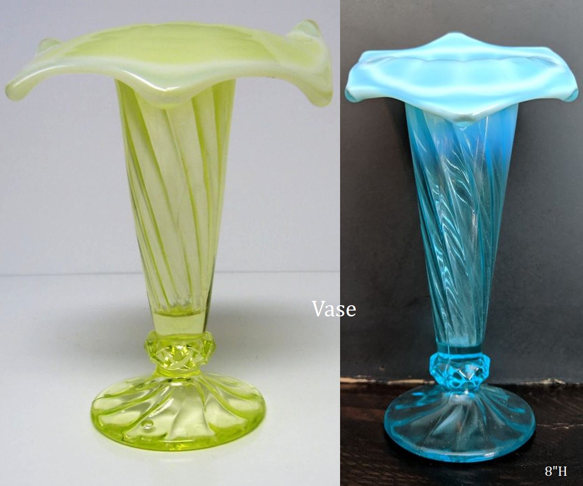 NOTE: Albany Museum 2024: This pattern was only made in vase form and in 3 different sizes. Model Flint made 6H, 8H, and 10H with multiple different variations of tops. All of these would have come out of the mould straight up and then "worked" by the glass workers to create many different shapes to the tops. They would need to reheat the top portion to create these shapes and the opalescence. The Museum has many shards in opaque colors