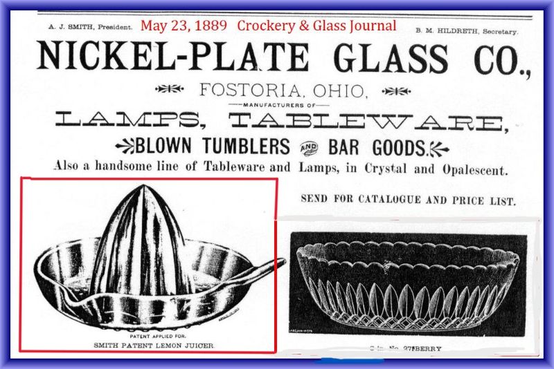 SMITH PATENT LEMON JUICER (OMN) by Nickel Plate Glass Company/Fostoria-Ohio (Company Operated: 1888-1891), c1888 introduced