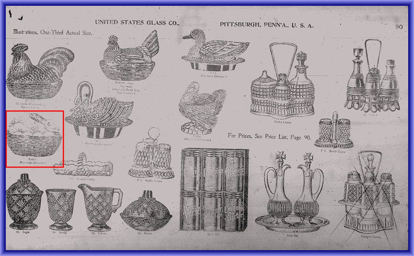 NOTE: Sid Lethbridge 2022: It appears in the 1898 US Glass Co. general catalogue listed as Rabbit (below). In the 1904 US Glass catalogue it is listed as Large Rabbit. Could date earlier of course but does not appear in the Challinor, Taylor catalogues or in the Central Glass Co. catalogues or price list.