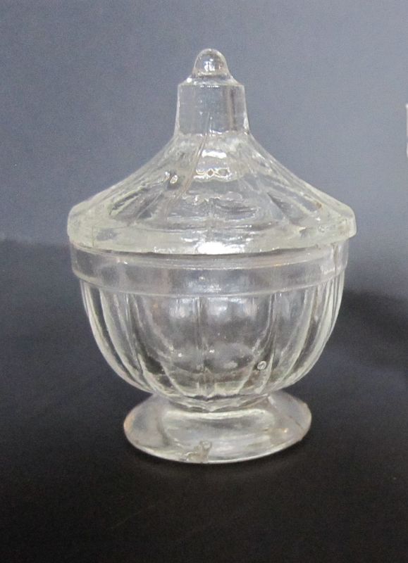 NOTE: Liz Roach 2025: seen in Barlow and Kaiser vol 3 p.225. Attribution is uncertain--maker could have been any one of the many glasshouses making toys during this period. Sugar bowl is 2" high with cover and 1-1/2" in diameter.
