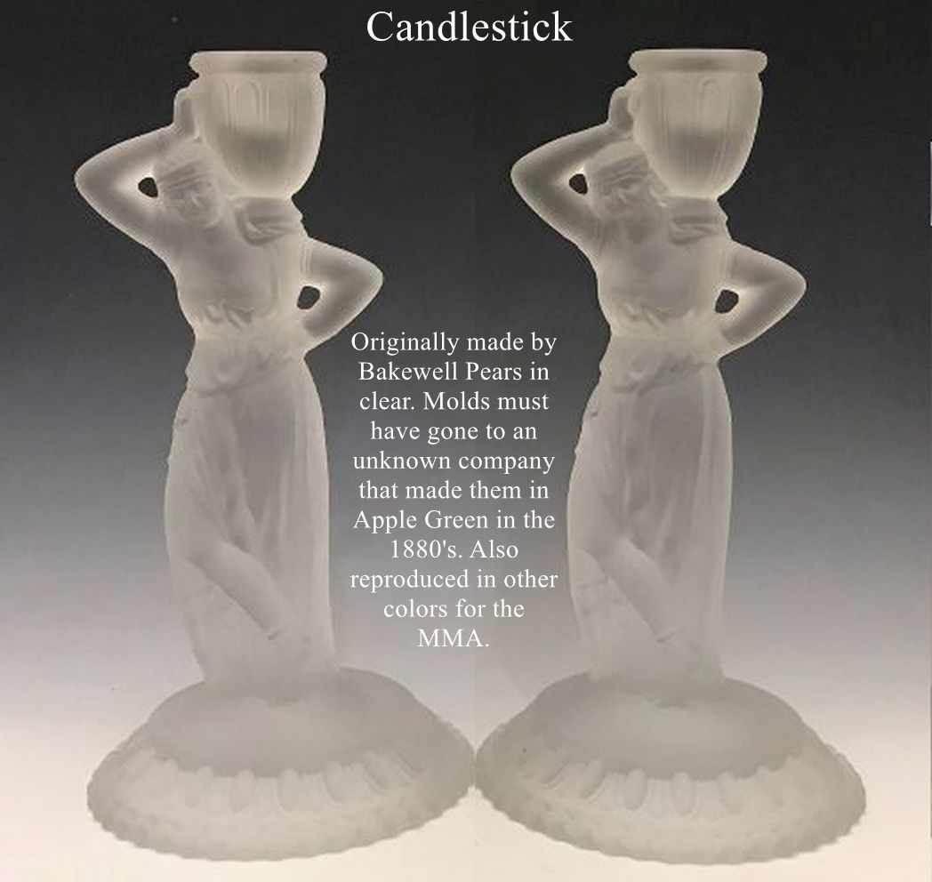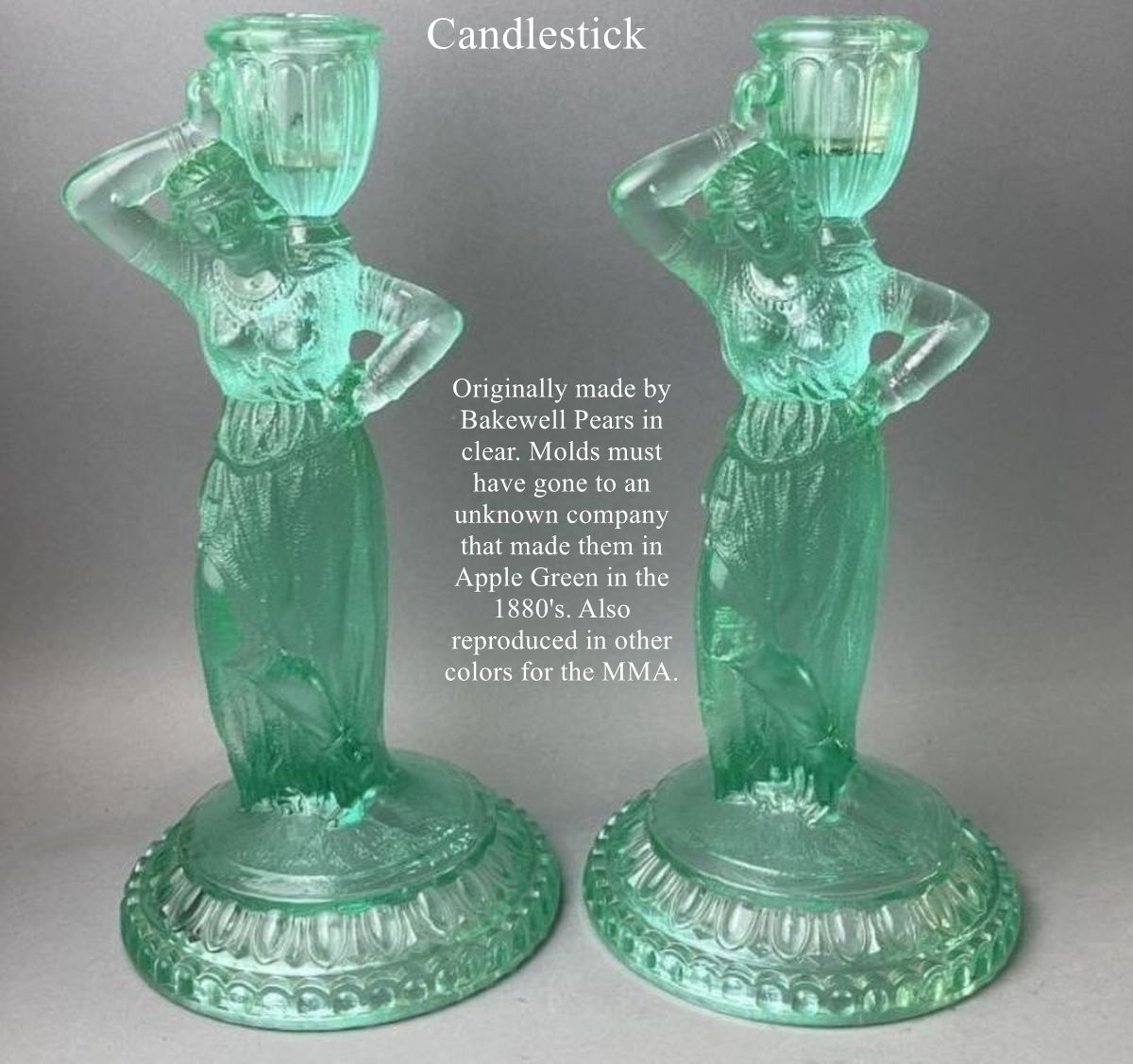 NOTE: Originally made by Bakewell Pears in clear. Molds must have gone to an unknown company that made them in Apple Green in the 1880's. Also reproduced in other colors for the MMA.