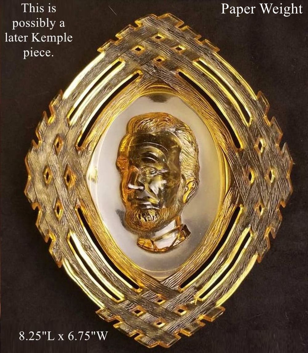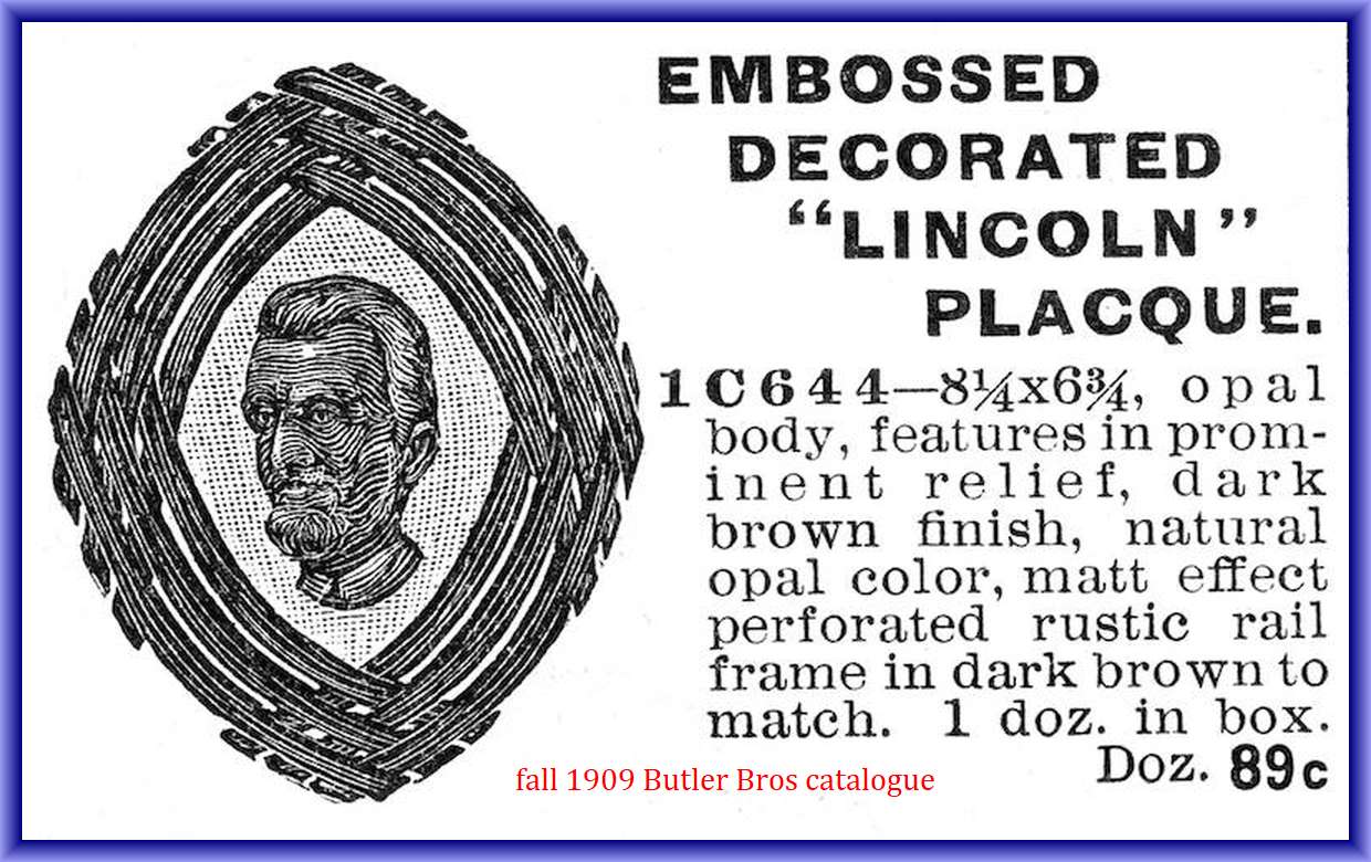 NOTE: Sid Lethbridge: The date of introduction is c1909 which would be the 100th birthday of Lincoln. Here is a cut from a Fall 1909 Butler Bros. catalogue. The original maker is not known but likely is not Westmoreland. Kemple acquired the mould for this piece at some point in the late 1940s or the 1950s. That was well before Westmoreland went out of business. McKee is a distinct possibility but Kemple acquired their moulds from several other parties as well.