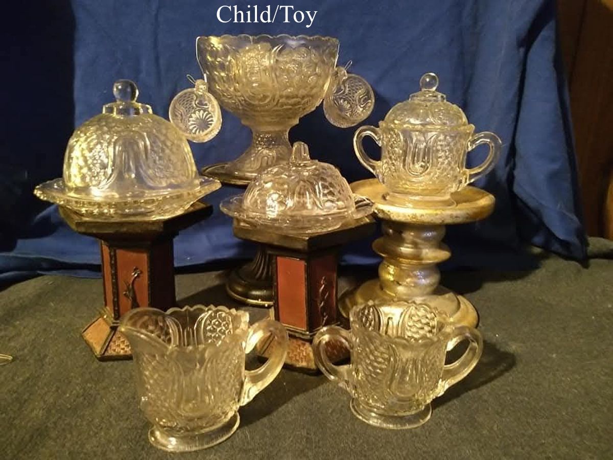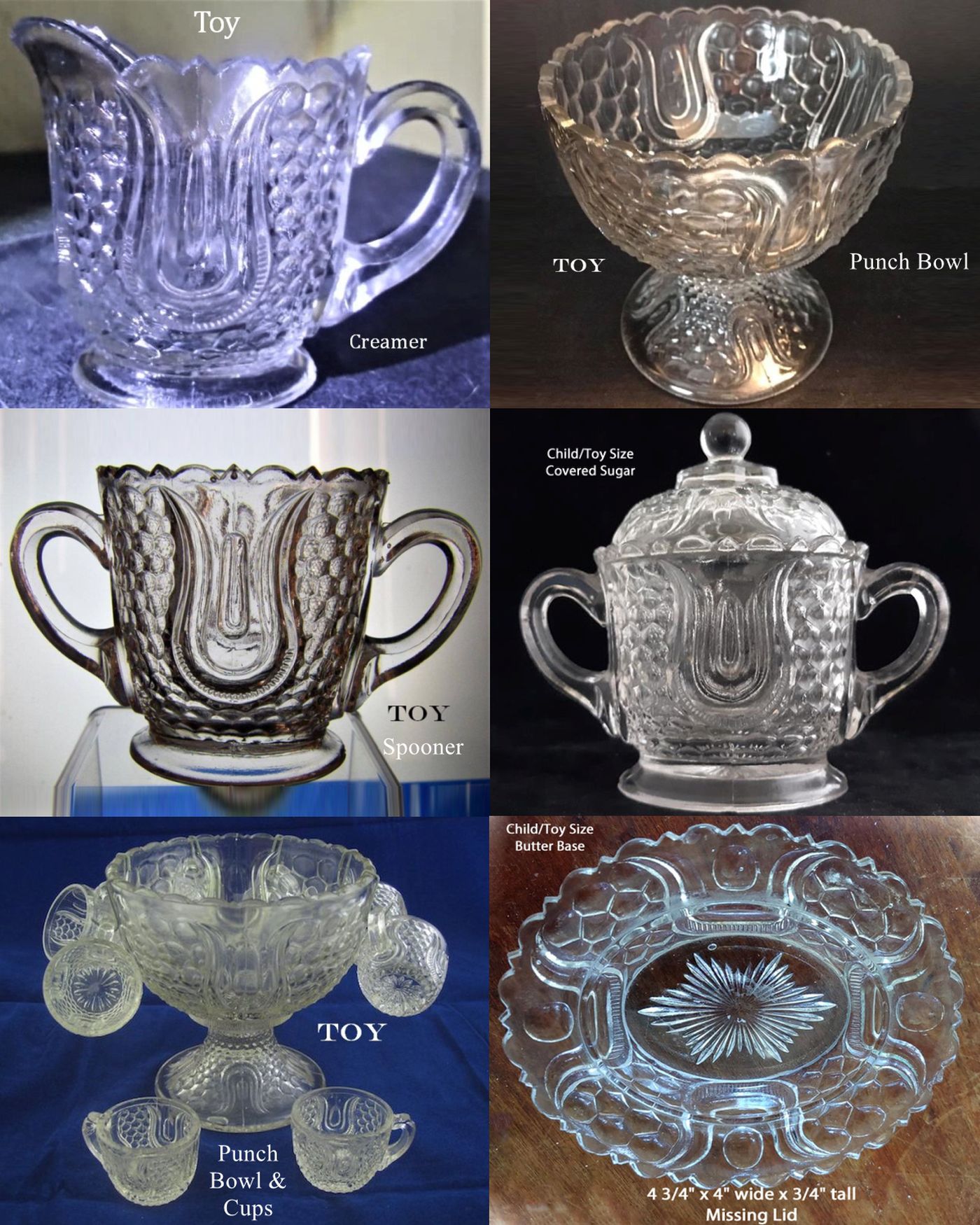 NOTE: Made in a child’s toy table set, a toy punch bowl, and a toy vegetable set consisting of two open bowls and two covered bowls.