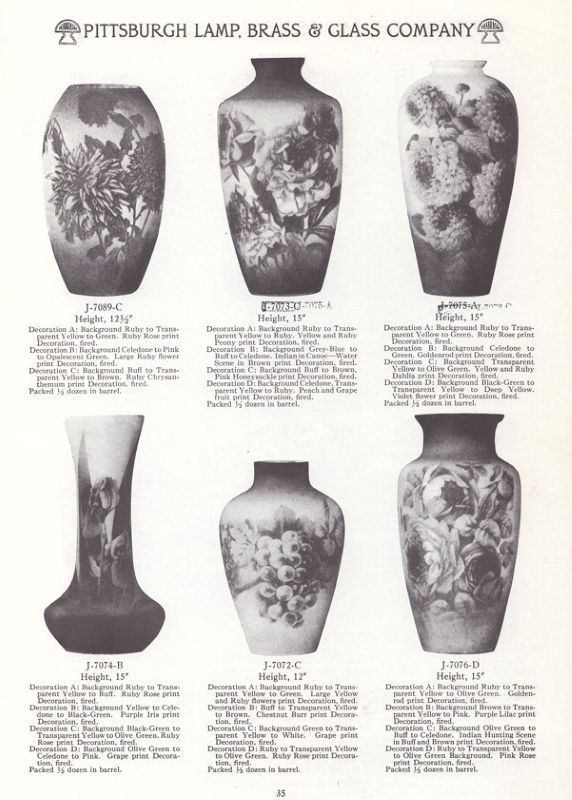 NOTE: Roger Haworth 2025 - These would have been made at Pilabrasgo's ex-Dithridge factory in Jeannette PA. Dithridge was making vase lamps well before the 1901/2 Pilabrasgo merger and production of them continued up until about 1920ish. Pilabrasgo (and probably Dithridge earlier) also offered the lamp bases as stand-alone vases (catalog page is from 1905ish and shows the grape decoration -- another page shows the roses).