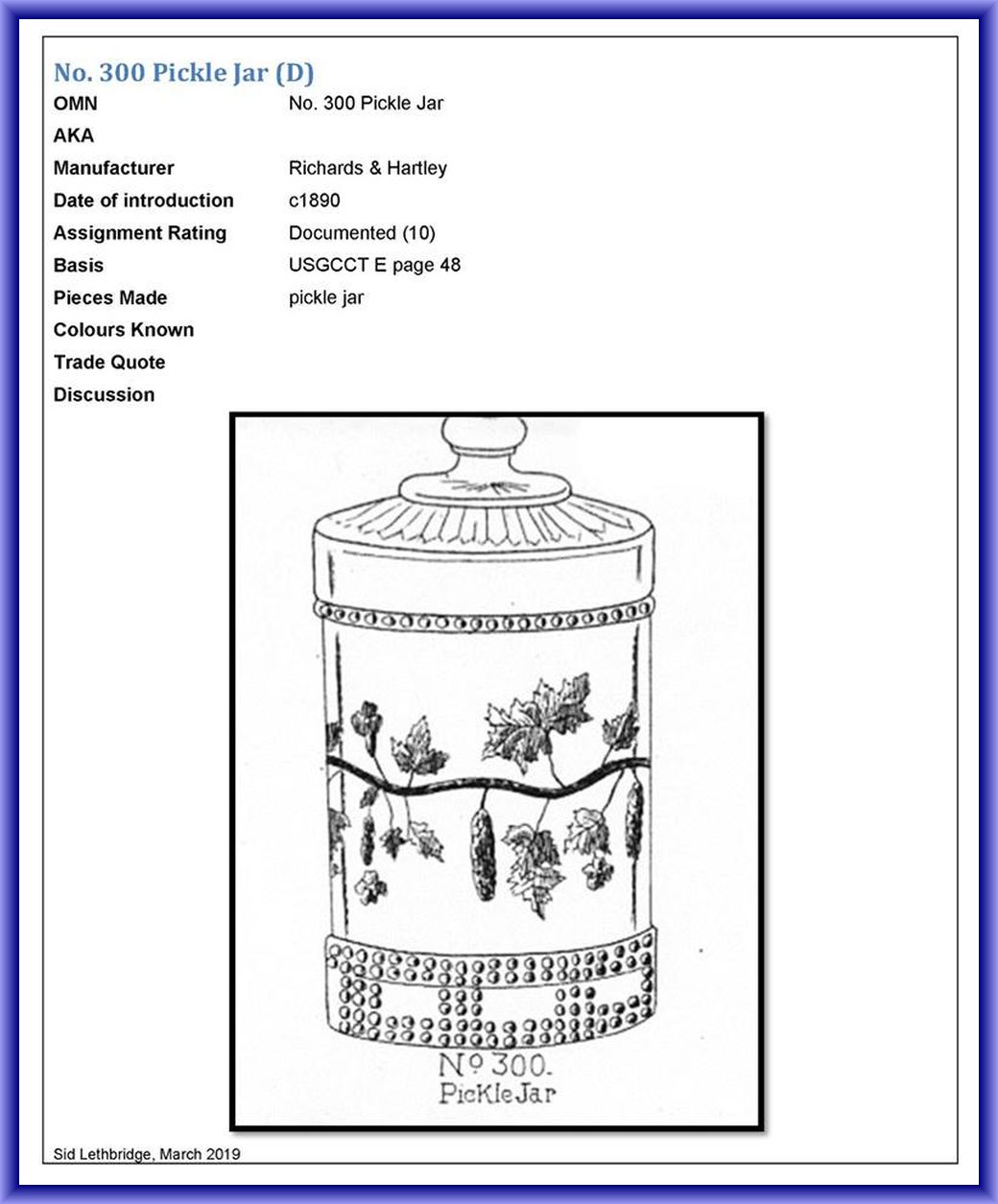 NOTE: Shown on page 118 of U.S. Glass by Heacock/Bickenheuser. No. 300 Pickle Jar (OMN) introduced before 1891.