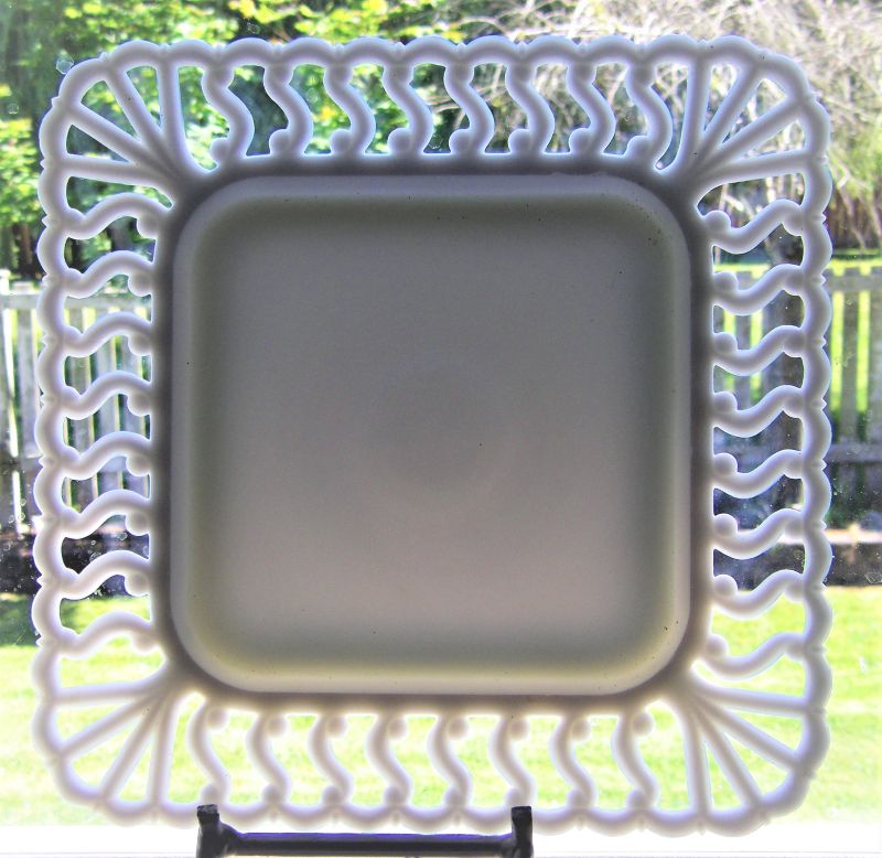 NOTE: Found in 1898 wholesale catalogue. Made in black and white in various sizes. Similar edge to West Virginia Glass Lace Edge triangular plate.