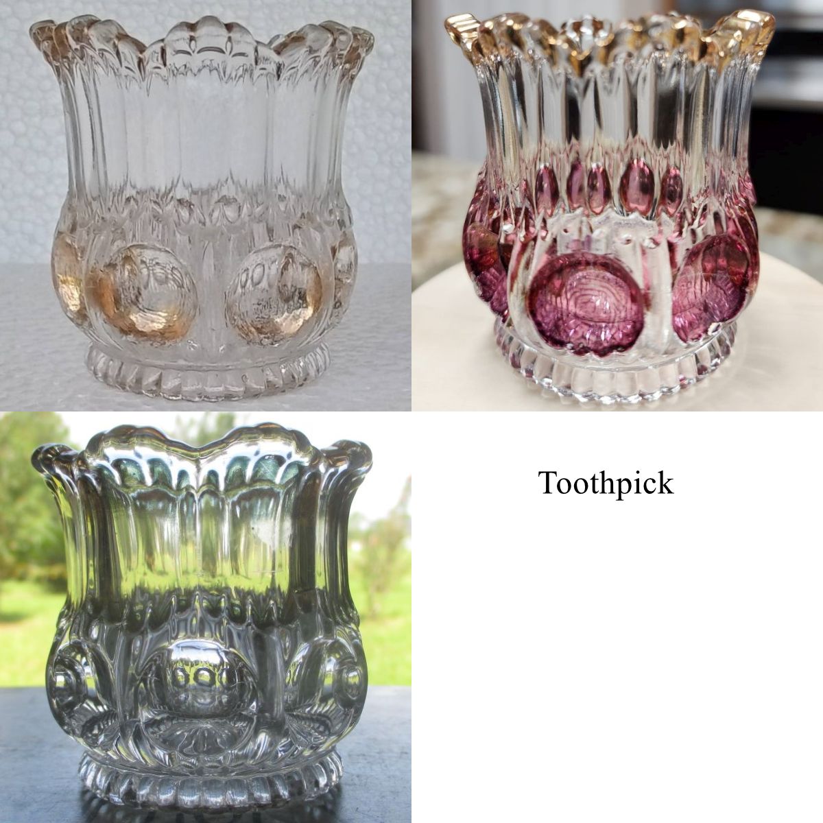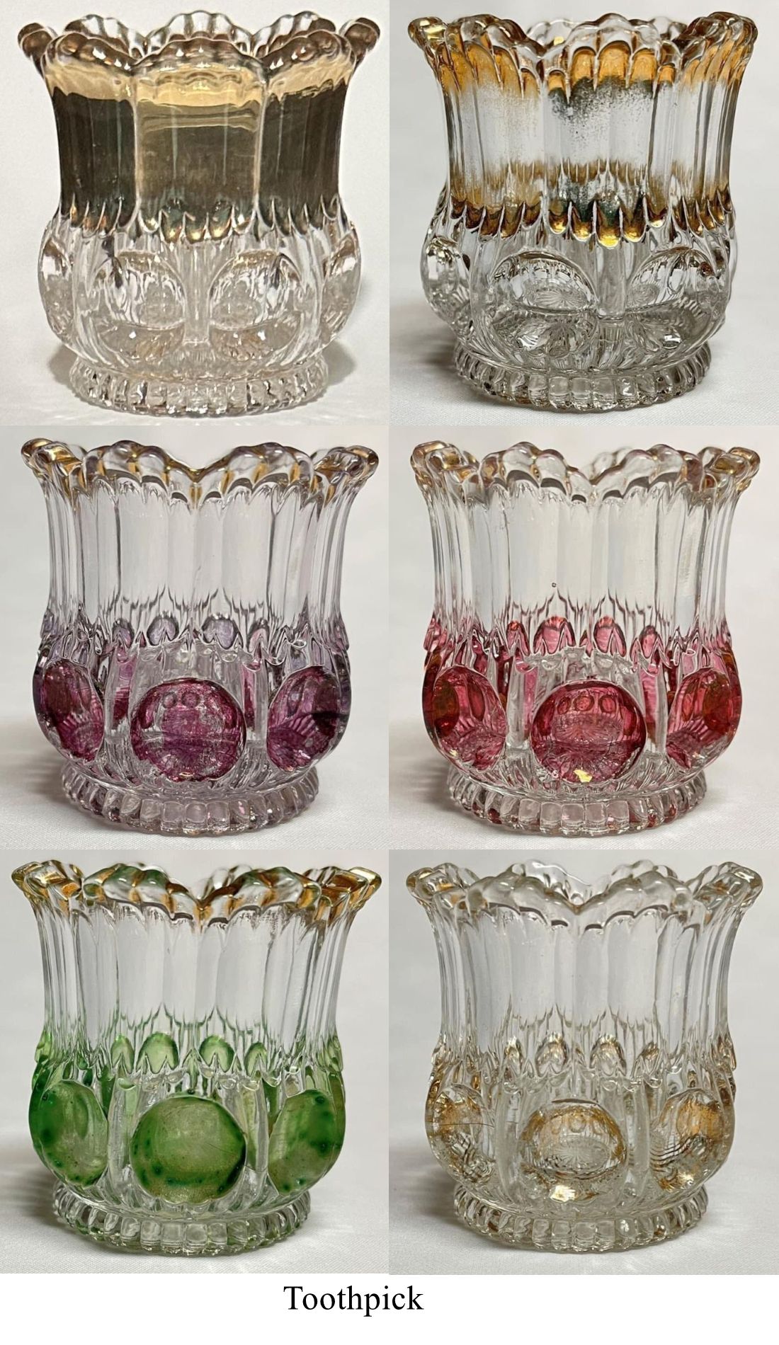 NOTE: 2025 Richard Ryan - "While no date or manufacturer is known, we do have a clue. There was only ONE company in the United States that had toothpick holders decorated with green, amethyst and cranberry stain. The United States Glass Company. Heacock thought it was likely by them, and I agree.