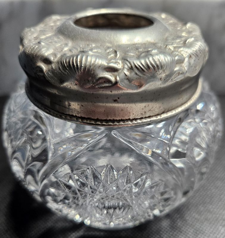 NOTE: Paul Kirk Jr 2025 - I've taken notice of this particular puff jar base since the 1990s. They show up somewhat regularly with metal tops for either a puff jar or hair receiver. Judging from the lids I've seen on them (I have one that is very Art Nouveau influenced), they date in the c. 1905-1920 timeframe.