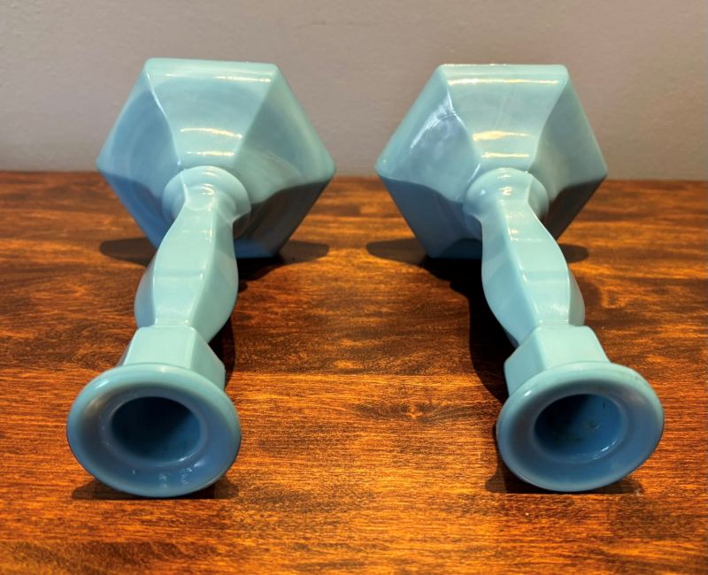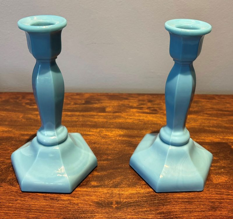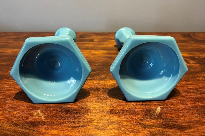 NOTE: Tom Felt 2025:"I'm pretty certain that these are Gillinder. I noticed the lack of serration, but suspect that may be due to mould wear. Not a 100% guarantee, but I don't know of any other company that made a similar shape." Known in crystal and opaque turquoise, Nile green, and custard, made in 3 sizes (7-8-9H, bases 3-1/2"D, 3-3/4"D, 4"D). Largest size has gold -encrusted decoration at base. ref Felt-Stoer, The Glass Candlestick Book vol 2, pp86-87 and Tom Felt, Museum of American Glass