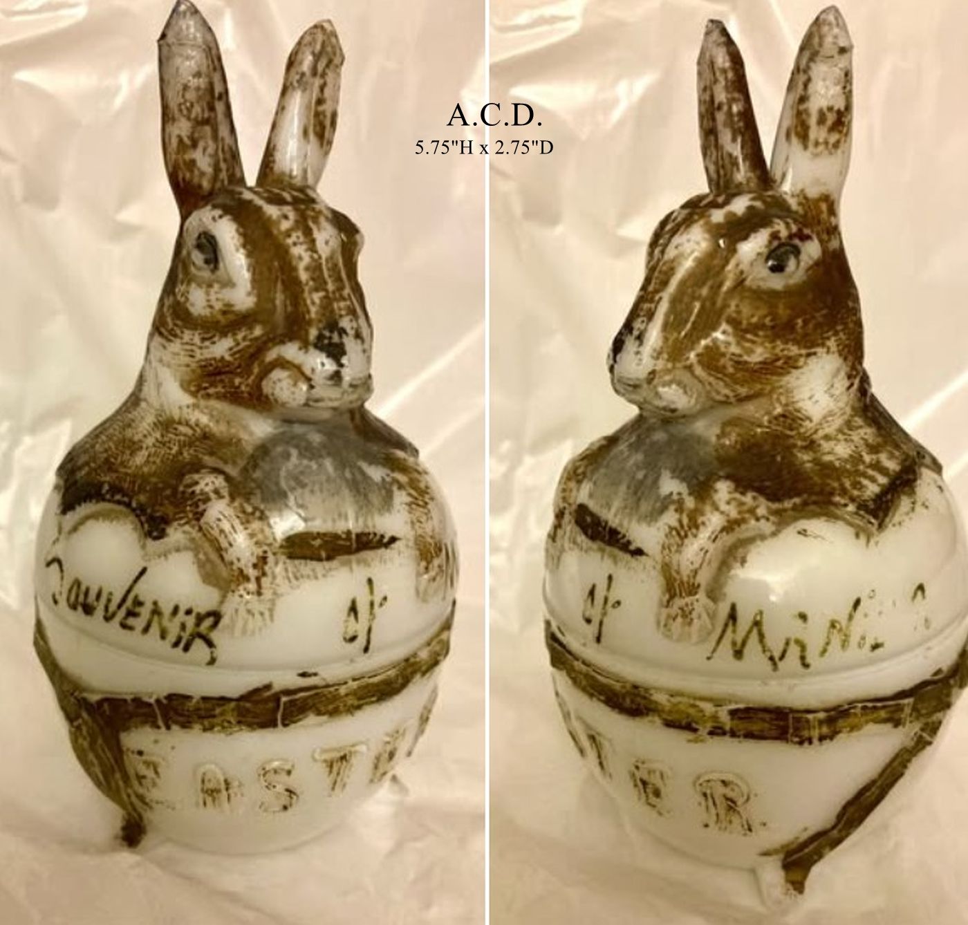 NOTE: Sid Ledthbridge - Easter Rabbit Emerging from Top of Egg Covered Dish" by Frank Chiarenza and James Slater (The Milk Glass Book, Fig. 139). Maker unknown, speculated as Dithridge.