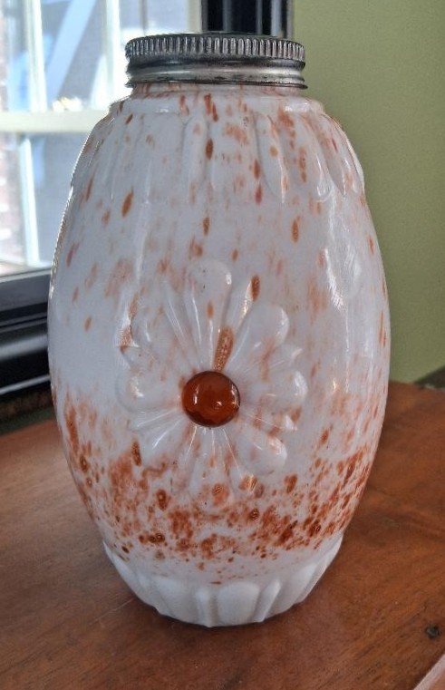 NOTE: Jeff Swantek 2-2-26 - re The Milk Glass Book by Chiarenza and Slater where they state it was previously "unlisted." They named it Jeweled-Oval Sugar Shaker, and although their version is white milk glass, they attribute it to Atterbury based on the "jeweled stone" as the same used for Atterbury's animal covered dishes eyes and the Pat Ap For on the base. I believe this marvered version adds to the Atterbury attribution.