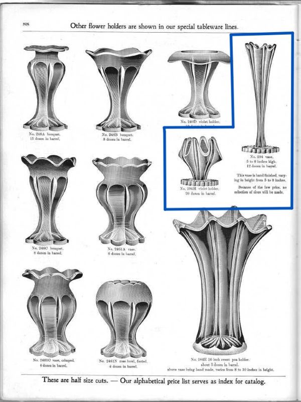 Contributor: Kathy Conn Turner 3-10-26 - violet vase - Only shown in Imperial’s 2nd general catalog circa 1906-07...does not appear in any subsequent catalogs, so made for less than two years...same mould as bud v