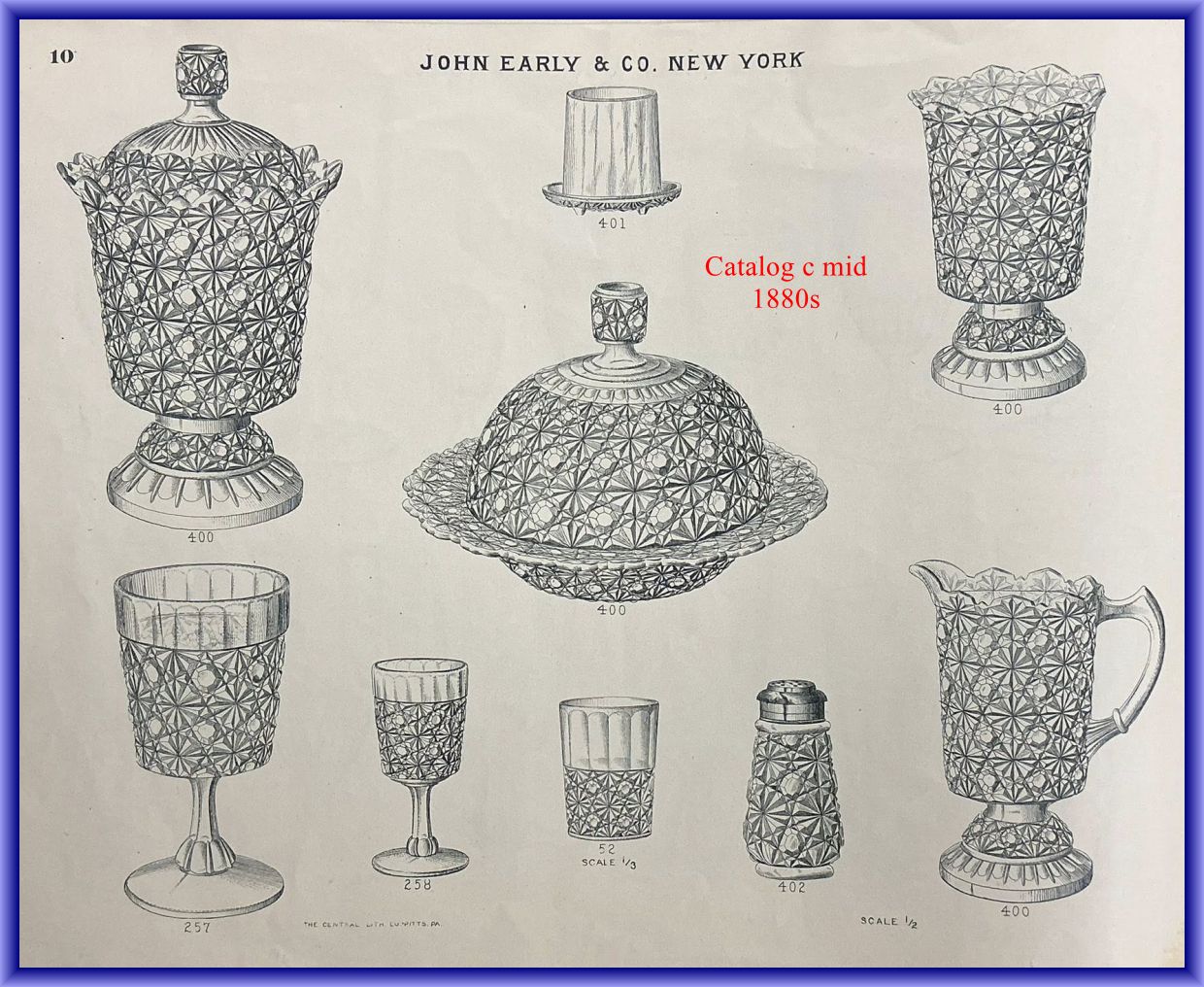 Contributor: Kathy Conn Turner - 3.75H, 2.38D at base, and 2.75D at rim. 11 optic panels inside. Base 20 pressed rays ground flat.