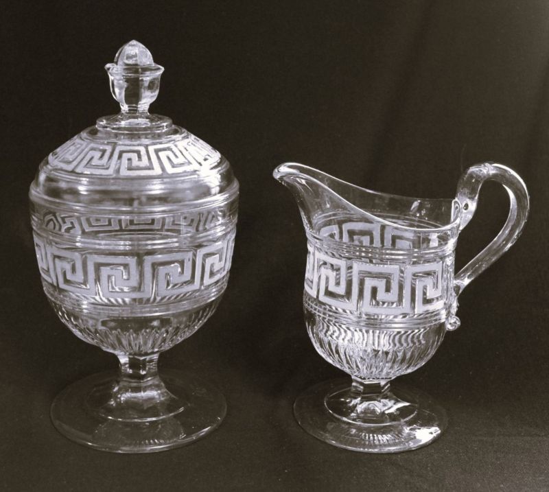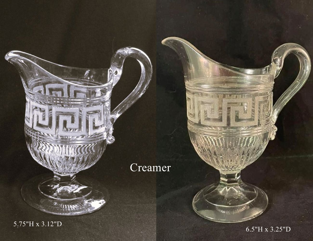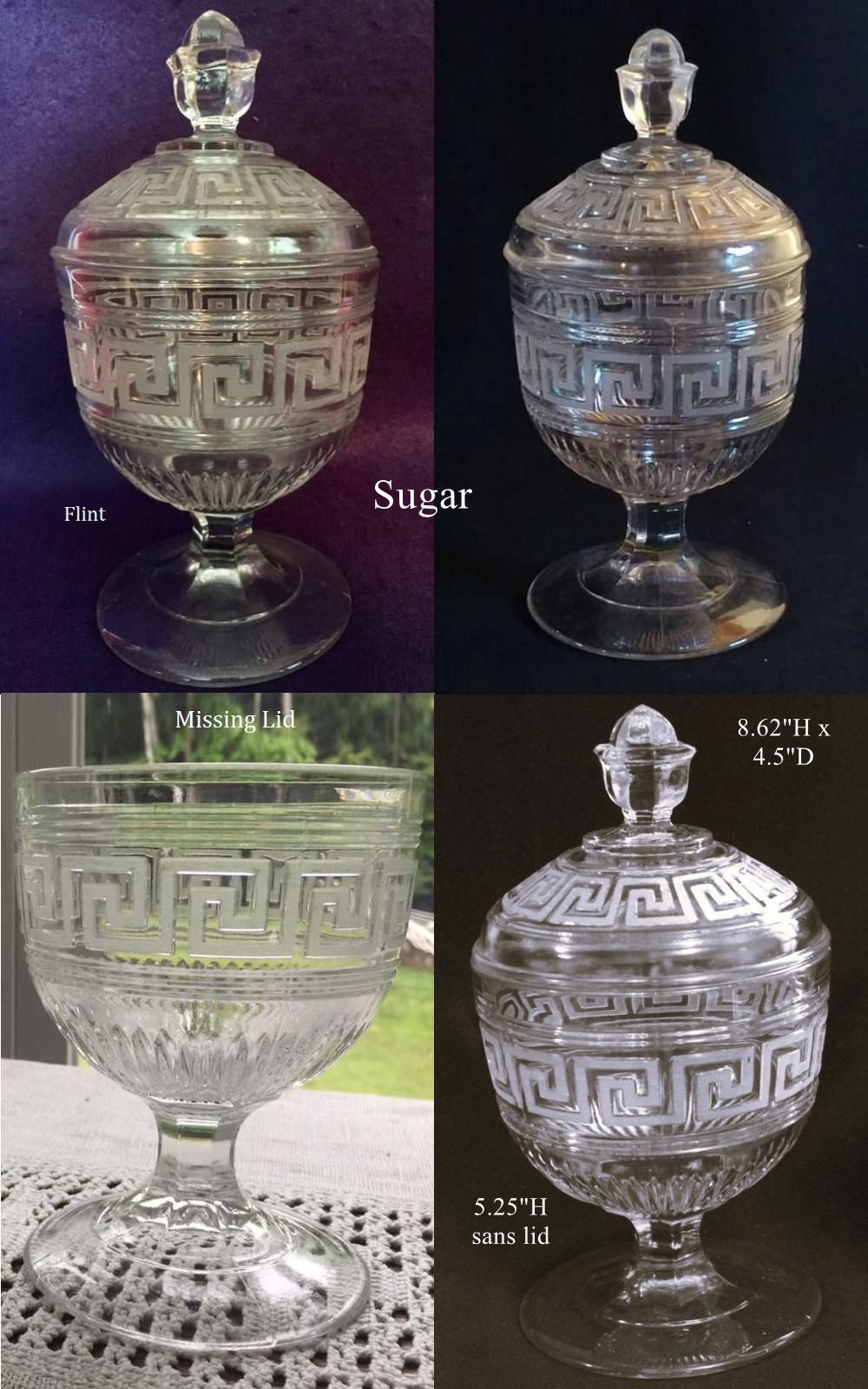 Contributor: Brady Fitts - Flint. Sugar 5.25H, opening 4.5D and 4D base. With cover, 8.62H. Creamer 5.75H, opening 3.12D, and 3.5D base.