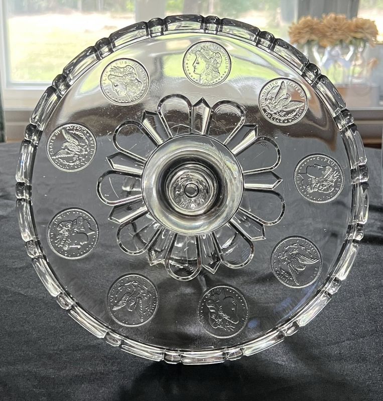 Contributor: Susan Smith 10L x 7W bread plate with 15 coins total and 5 Morgan dollars down center
