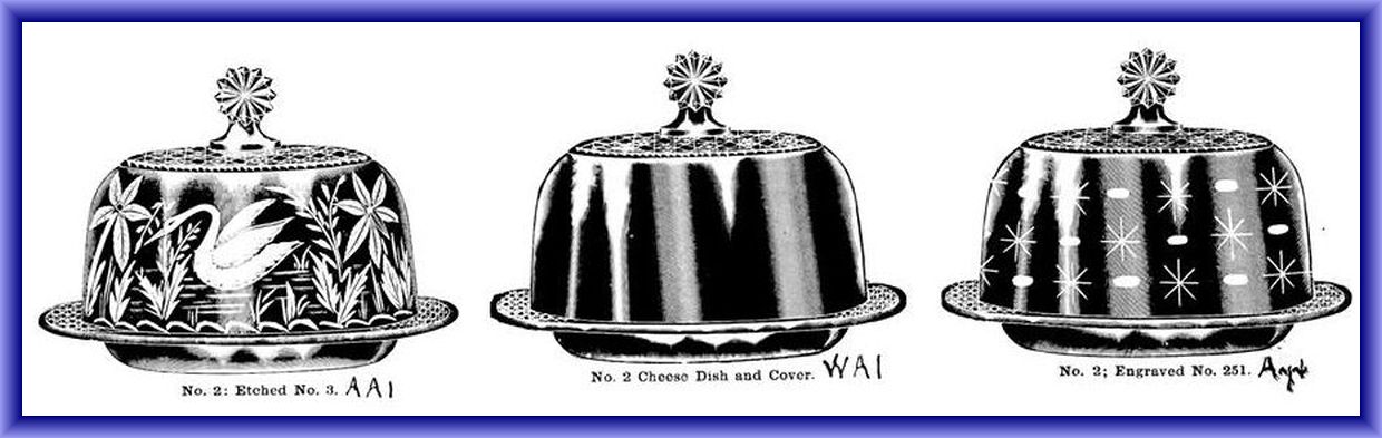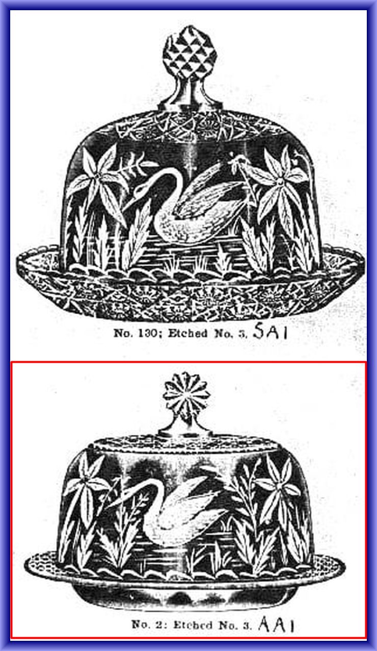 NOTE: The clear dome could be etched or engraved. Made in two styles- a high domed cover and a low flat cover. Example here has #3 etch aka Feeding Swan.