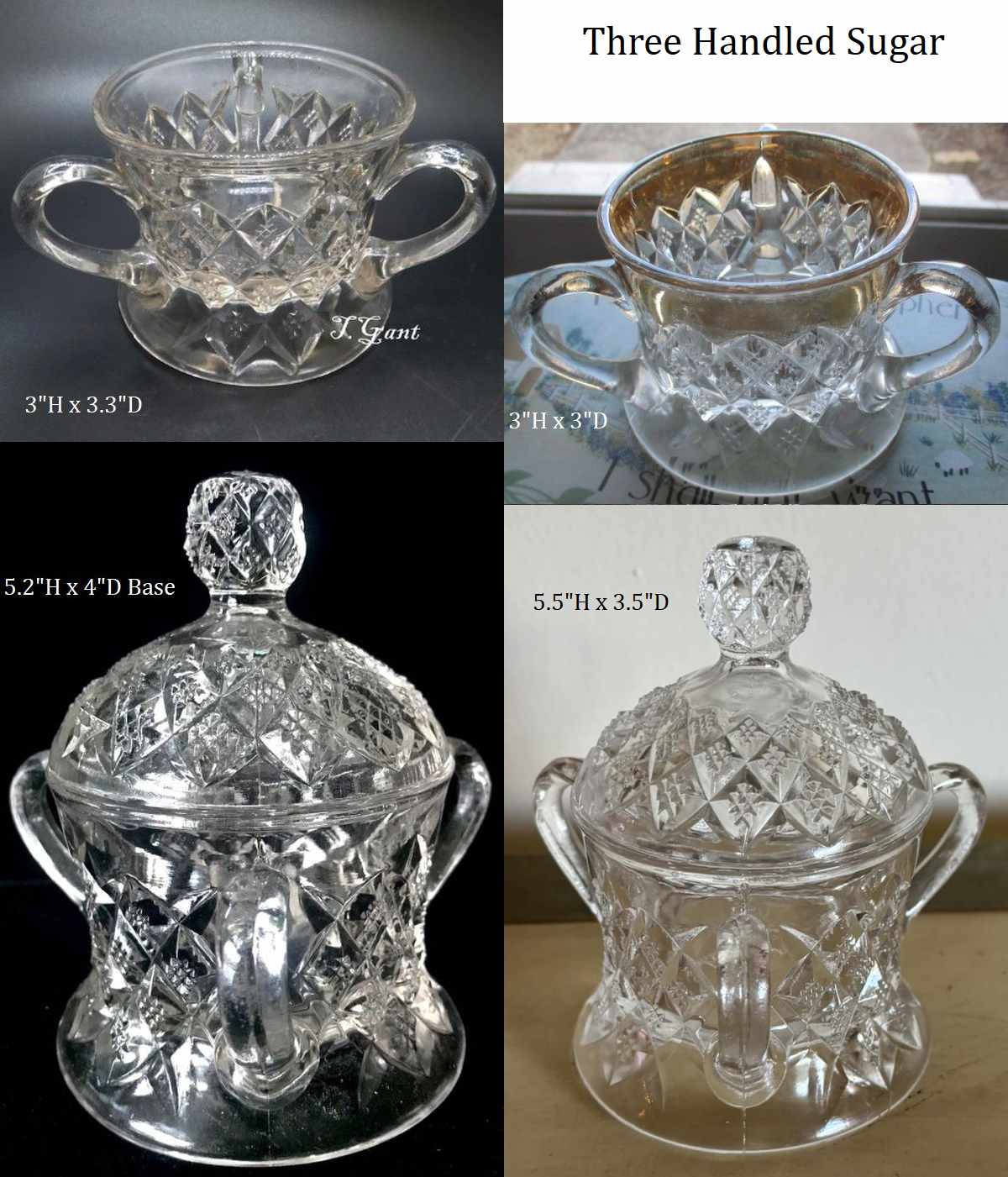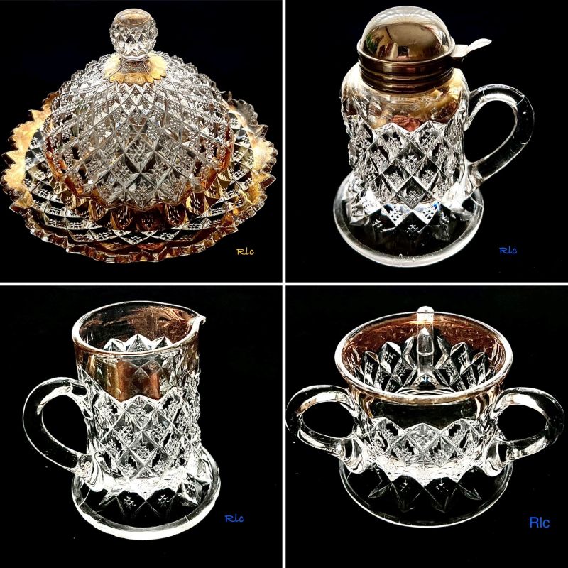 Contributor: Rich Cornwell - Butter and Cover, Small Syurp with Nickel Plated Lid, Individual Cream, and Open Three Handled Sugar.