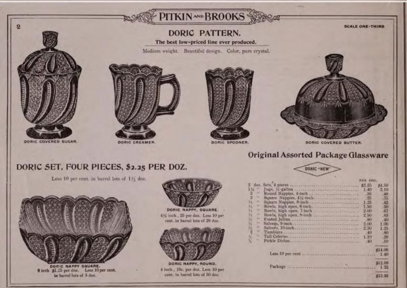 Contributor: Roger Haworth - 1900 Butler Brothers assortment with other Doric and McKee items. Covered sugar shown with design on base.