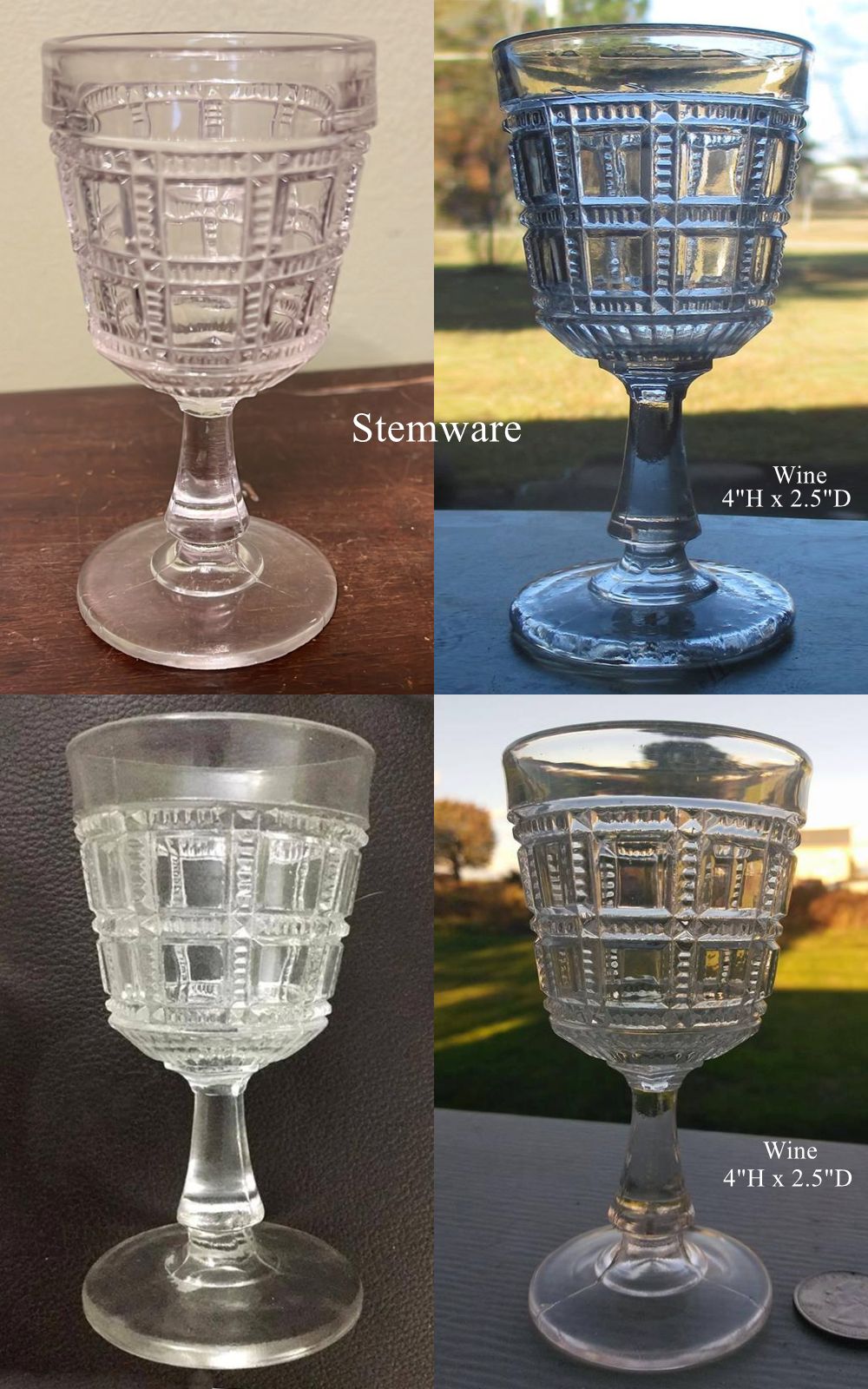 Re goblets: Sid Lethbridge:King No. 311 by King Glass Co., late 1880s. Ref. American Pressed Glass and Figural Bottles by Revi, p216. The wine was renumbered by US Glass as their No. 4772 (1898 US Glass catalog)