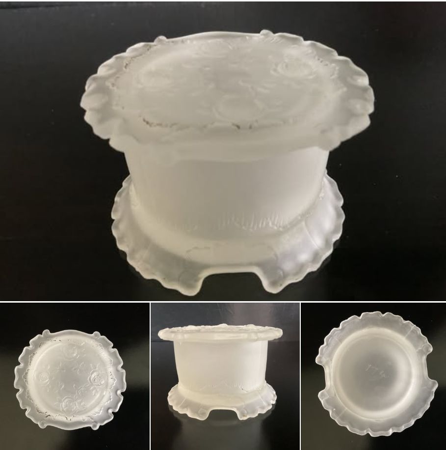 Contributor: Gwynne Goodlett 5 1/8” square, about 2/14” tall. marked 186 on underside of base. Handkerchief box