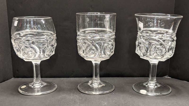 Contributor: Albany Glass Museum = trio of goblets in Etruria pattern. Most examples will look like one in the middle. It is very interesting and rare, that the examples on the outside have had top rim worked and