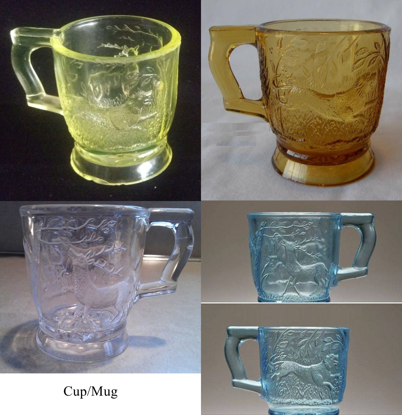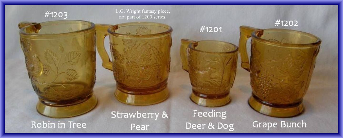 NOTE: Bryce No. 1201 "Feeding Deer & Dog" - part of a graduated set including "Robin in a Tree", "Grape Bunch", "Feeding Deer & Dog", and "Pugs & Chicks". "Strawberry & Pear" has same handle and bowl shape, but is not considered part of the set (found to be an L.G. Wright fantasy piece). Set numbered Bryce Bros Nos. 1200-1203, smallest to largest. This pattern has been reproduced by Mosser Glass Co.