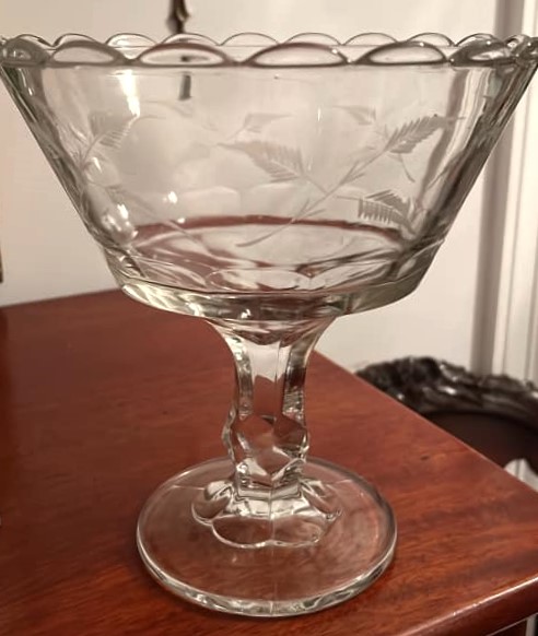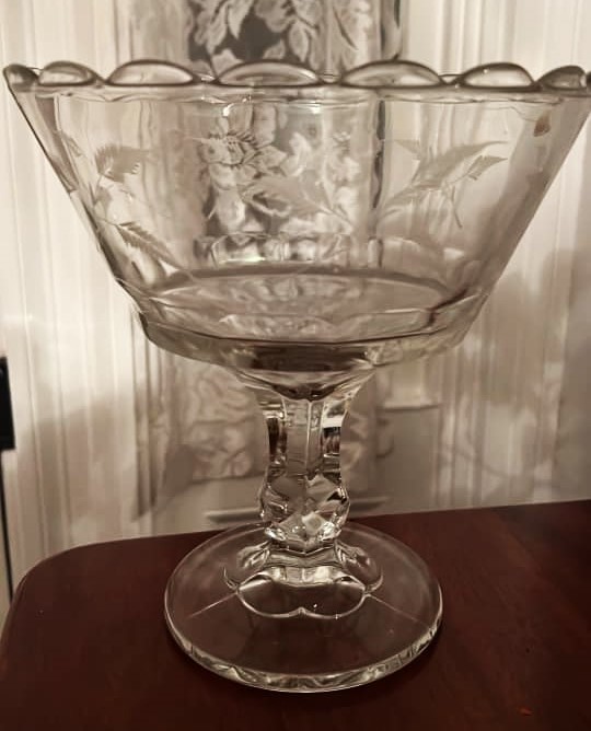 Contributor: Chris Kraus It appears that R&H used the same comport as the base for both patterns. If it is an open comport, then No. 303. With a lid this would also fit in SCALLOPED LION. 8 3/8"D just the ope