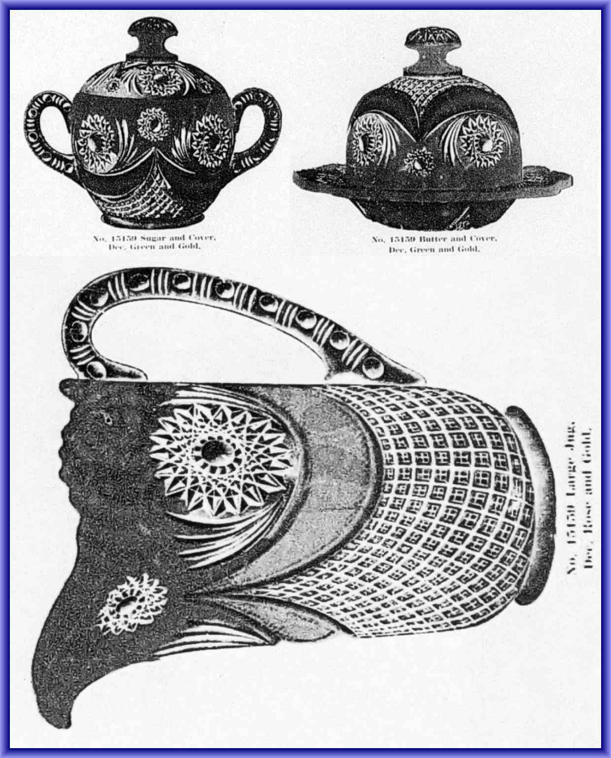 NOTE: Sid Lethbridge: Recent research has revealed that US Glass modified the No. 15108 Perfection aka Star and Crescent moulds to remove the thumbprints in the crescents to create a new line No. 15,159 which was introduced c1915. It appears that US Glass was reworking the moulds of earlier lines and issuing them as new patterns in this time frame.