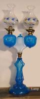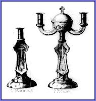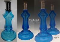 • NOTE: Design patent No 3834 to DC Ripley 1 Feb 1870, marked Ripley & Co.. Known configurations include candlestick with pewter holder; fitted with a baptismal font with two arms for candles; or with a double font lamp (aka Wedding Lamp) with an integral match holder. ref Innes Pittsburgh Glass p 65.