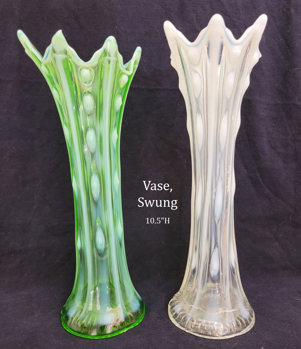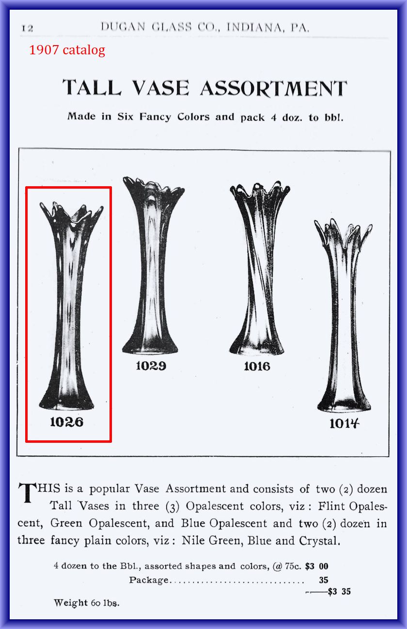 NOTE: Gene Serbus - the tall vase is No. 1026, and the short vase is No. 1027. Dugan appears to have assigned a different OMN (number) depending on height or crimp style. This vase was shown by Heacock in Collecting Glass in a "Rare & Unlisted Opalescent Glass" article. It is also shown in an undated Dugan Glass Co. catalogue (c1907) as No.1026. The ad states the "Tall Vase Assortment" was made in six fancy colors (three opalescent, Nile green, blue, and crystal). This pattern was continued by the Diamond Glass Co. but was listed as 1027-R in Diamond's Pearl Iris line.
