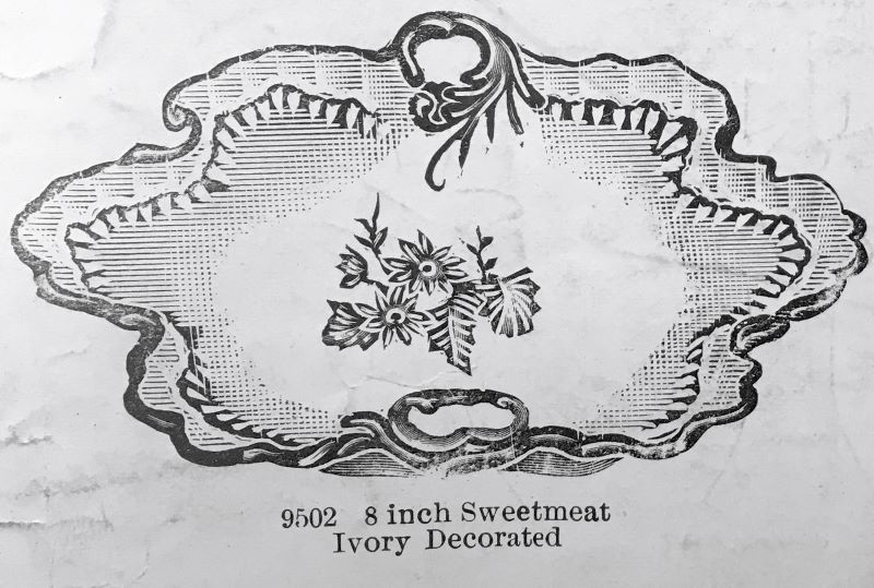 NOTE: Sid Lethbridge 2023: catalogue image of the **No. 9502 (OMN) ** 8" sweetmeat. US Glass introduced their ivory line in the middle of 1899. It is not a custard glass as the name would suggest, instead it is an off-white opaque glass.