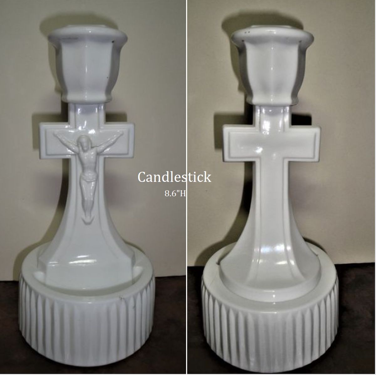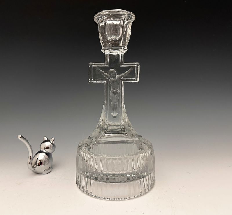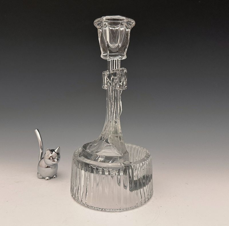NOTE: Martin Chaffee 2025: re clear stick-- Martin Chaffee 2025: a U.S. Glass candlestick with holy water font. It was made circa 1891-1904 with initial production for U.S. Glass was by Factory C (the old Challinor, Taylor plant) and then later likely Factory F (the Ripley & Company plant). It measures about 8 5/8 inches high and has a base diameter of 4 ¼ inches. This is from the exquisite collection of Rich and Elaine Stoer. Reference The Glass Candlestick Book, Felt/Stoer, Volume 3, page 215 and page 331.