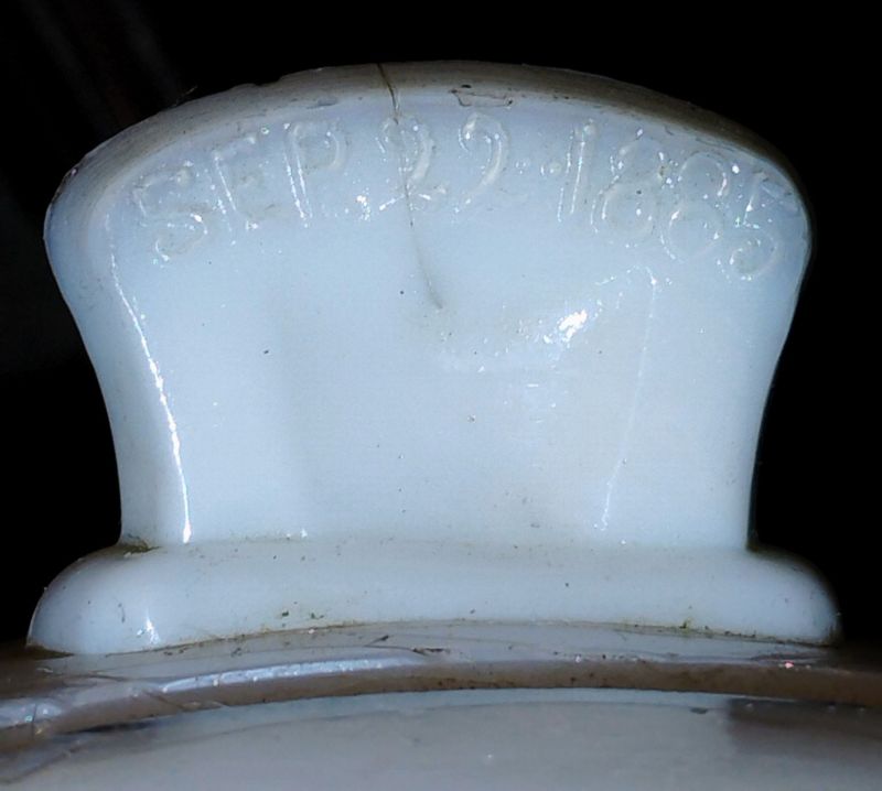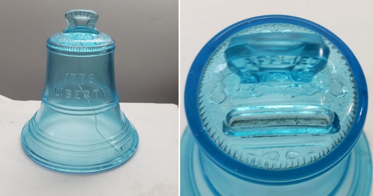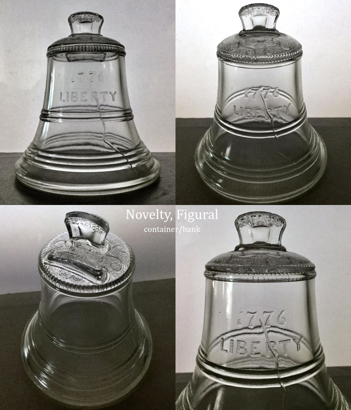 NOTE: Ref. Museum of American Glass, WV - Patented Sept. 22, 1885 as D326,757 by J. Frederick Loeble of Philadelphia. Advertised in 1885 by Robinson & Loeble, manufacturers of mince meats, fruit butters, preserves and jellies, Philadelphia, sole owners of the Liberty Bell Jelly Cup and Savings Bank for Children. According to the ad copy: "This miniature Bell will teach the young folks patriotism and economy, as it can be used as a Savings Bank for children, by breaking out the small piece of glass in the slot on the top of the Bell."