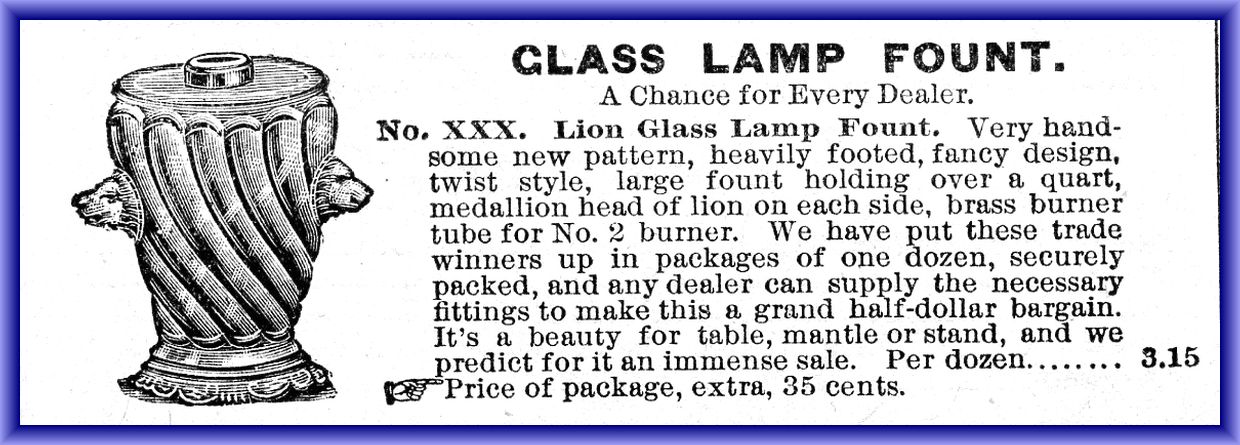 NOTE: Here we have a catalogue cut of a Lion (OMN) lamp. The maker of the lamp is almost certainly Model Flint. "who make a handsome pressed lamp called the "Lion" of massive shape and large capacity for oil. It takes a No. 2 or No. 3 collar." The quote is from the July 20, 1892 issue of China, Glass & Lamps. This cut is from an 1893 CM Linnington wholesale catalogue.