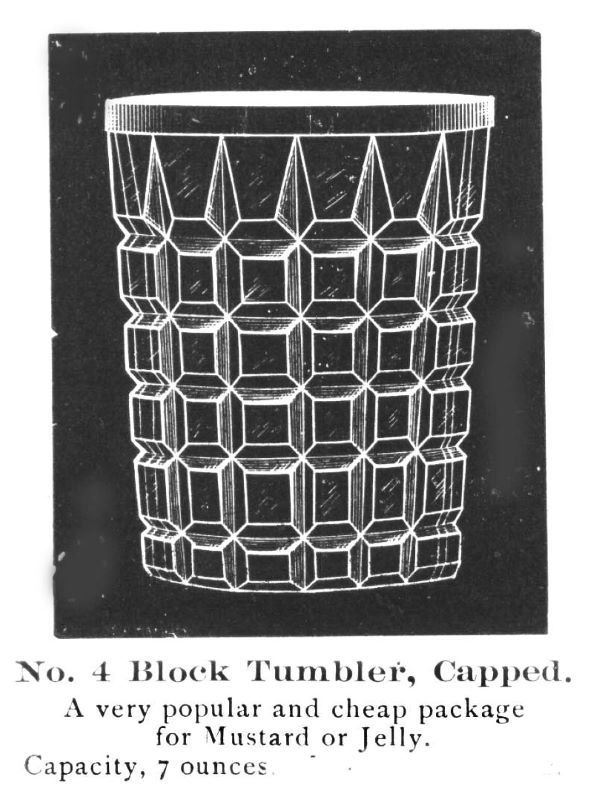 NOTE: Sid Lethbridge 2023: It was meant for the packing trade to be filled with mustard and jelly. When emptied, the household had a useful article in the form of a tumbler. The date of introduction is uncertain but Tom Bredehoft had suggested c1893.