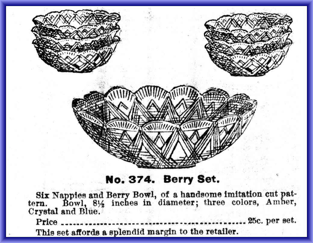 NOTE: This appears in several 1888 wholesale catalogues in crystal, amber and blue. What is most interesting is this wholesale catalogue assortment where it is designated as No. 374. This particular wholesaler tried to disguise the manufacturer's pattern number by multiplying it by 2 suggesting that the OMN for this berry set is No. 187. The question remains as to who made it.