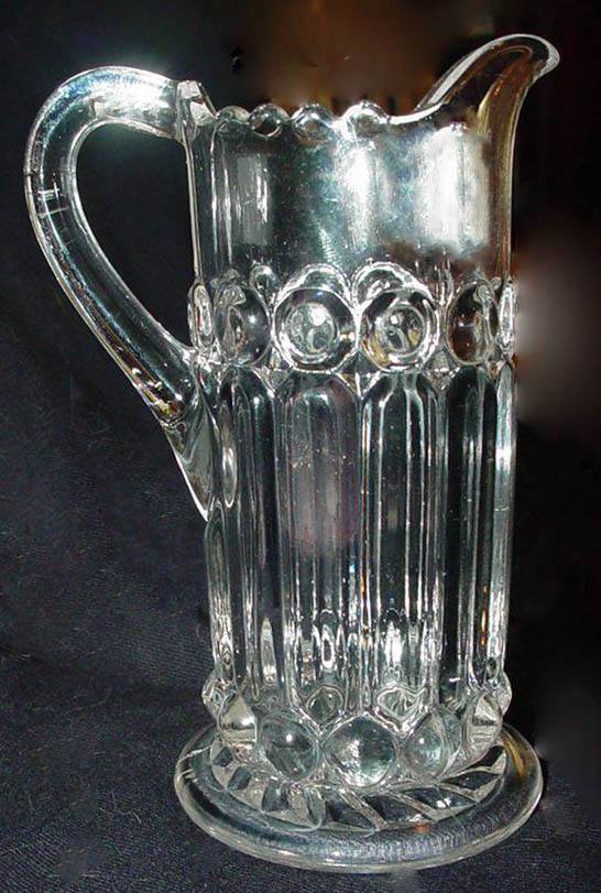 NOTE: Speculated as Westmoreland Specialty Company by Kamm, due to similarity to WSC Esther pattern. The "bars" have a peaked form. There are two similar patterns: Prism with Ball and Button (aka) and Prism with Ball and Button (aka) Variant.