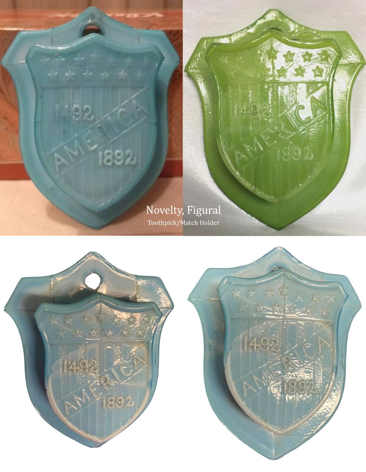 NOTE: Richard Ryan 2019 - The America Shield was made by Factory C of the United States Glass Company in 1892. Challinor, Taylor & Co. In addition to this green and blue, it was made in black, opal and clear. also see COLUMBIAN EXPOSITION SOUVENIRS