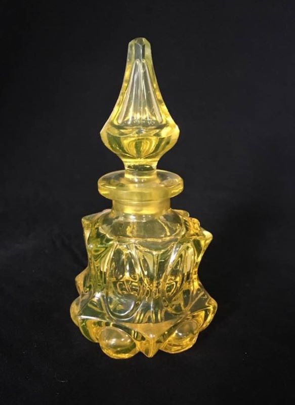 Contributor: Sam Kissee - cut stopper and polished pontil. 4.5H. Shown on the cover of Peterson’s Vaseline Glass book