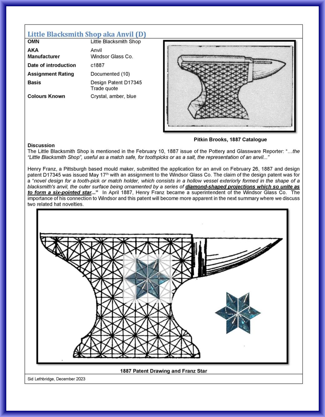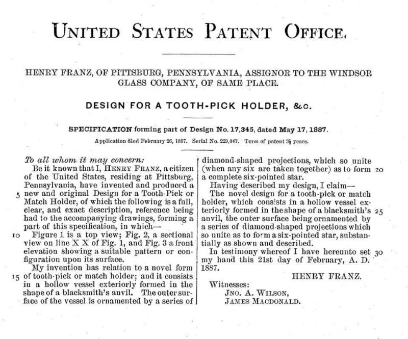 LITTLE BLACKSMITH SHOP (OMN) by Windsor Glass Company/Pittsburgh-PA (Company Operated: 1886-1890), 1887 Introduced