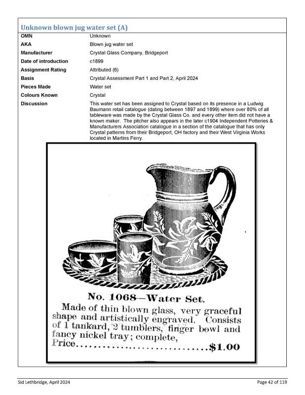 NOTE: Sid Lethbridge 2024 - assigned to Crystal based on its presence in a Ludwig Baumann retail catalogue where over 80% of all tableware was made by the Crystal Glass... and in the c1904 Independent Potteries & Manufacturers Association catalogue.